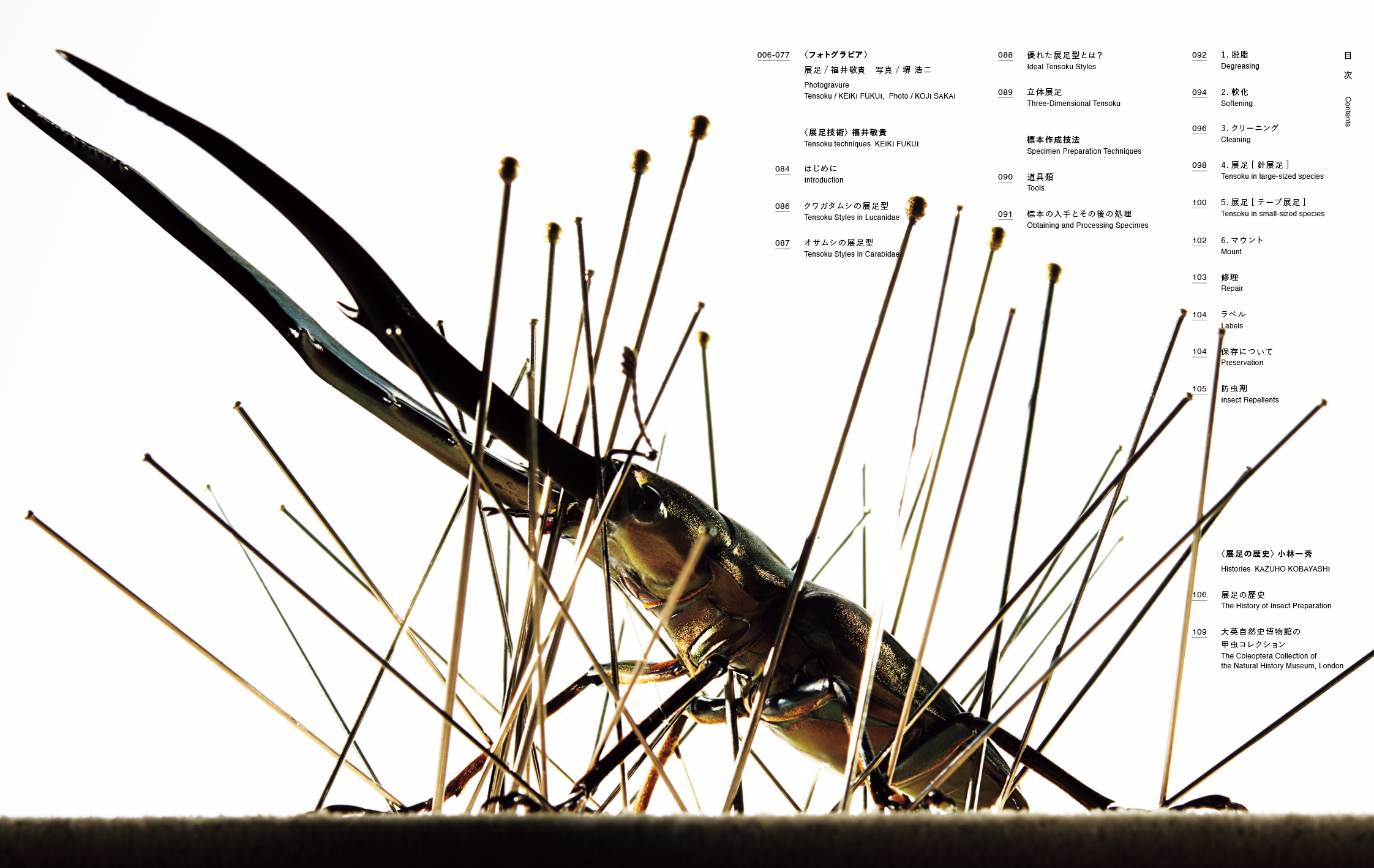 針で昆虫標本のポージングをしていく技術「展足(てんそく)」。昆虫標本を作る際に行われる作業のひとつですが、実は日本人の展足への拘り・技術は独特の文化をかたち作っており世界的に見ても異質なものです。本書は、気鋭の標本作家・福井敬貴氏による、その芸術的な「展足技術」にフォーカスした世界初のヴィジュアルブックです。