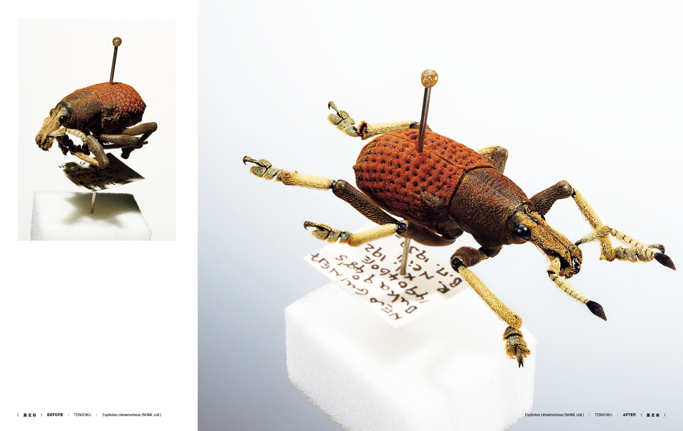 グラビアページでは、ダーウィンのコレクションなども眠る大英自然史博物館の稀少な昆虫標本たちを、特別な許可を得てクリーニング・再展足を行い、現代に美しく蘇らせました。状態が悪かった標本が、展足技術によってドラスティックな変化を遂げて生まれ変わる。そんなビフォーアフターの数々を堪能することができます。