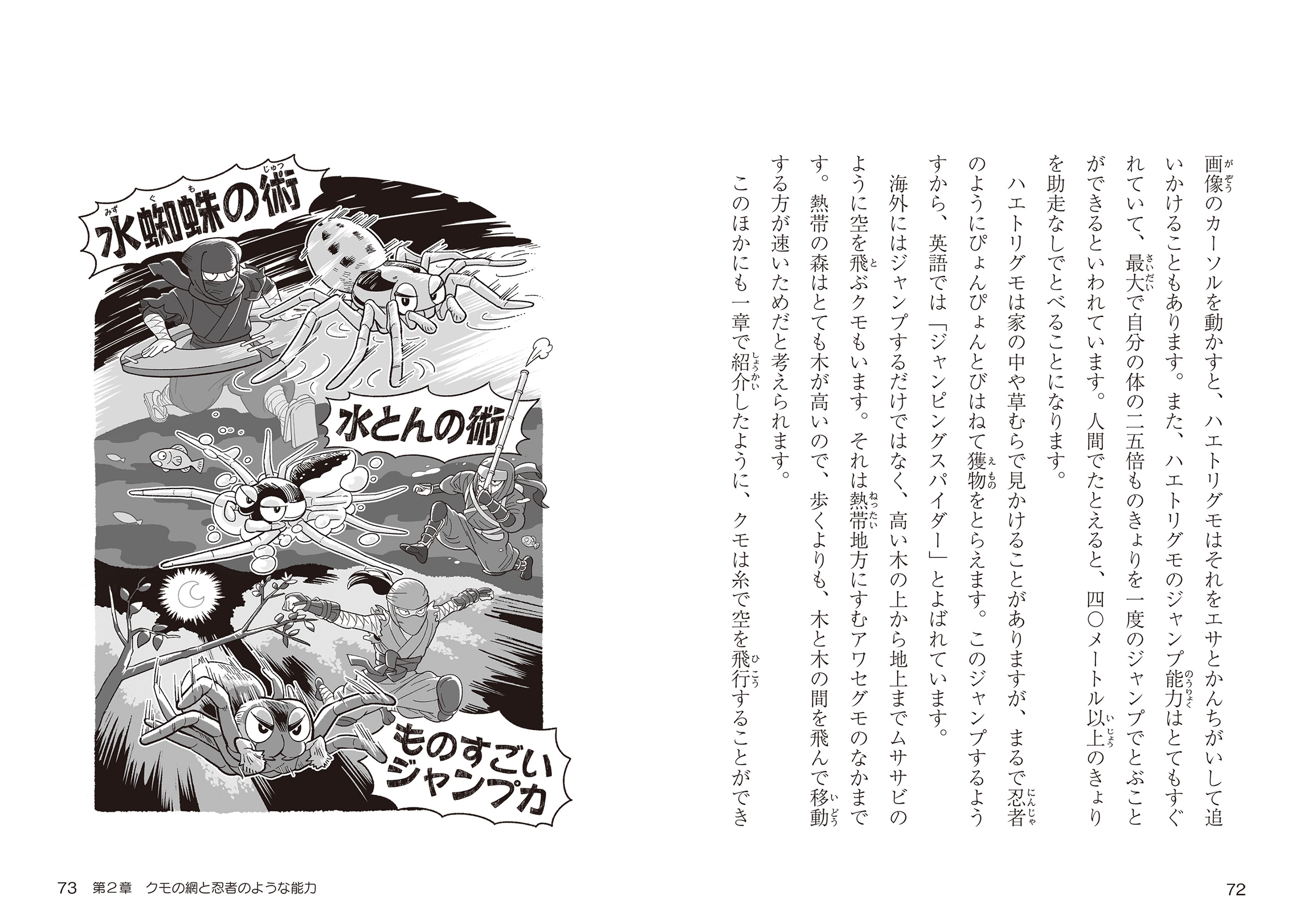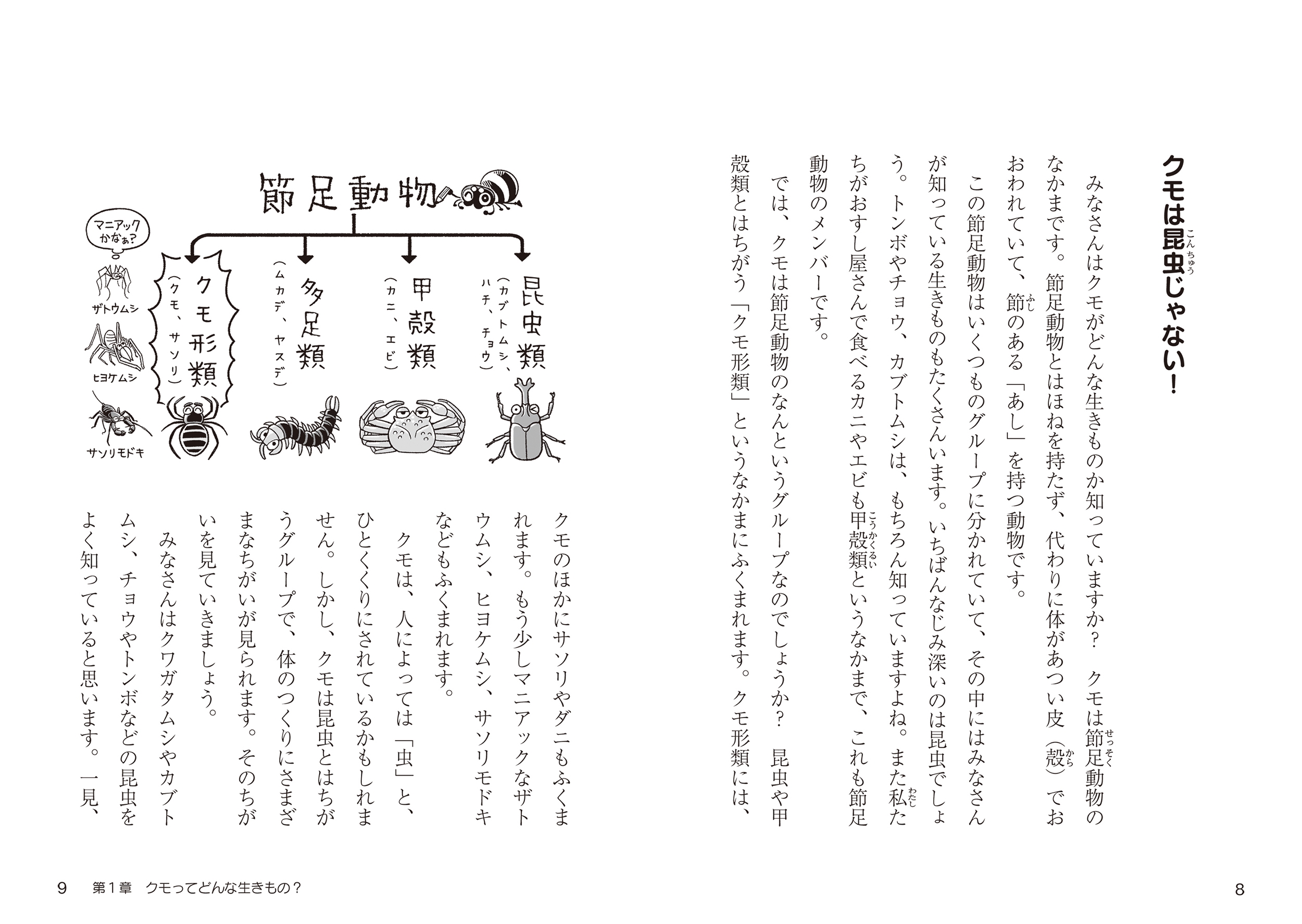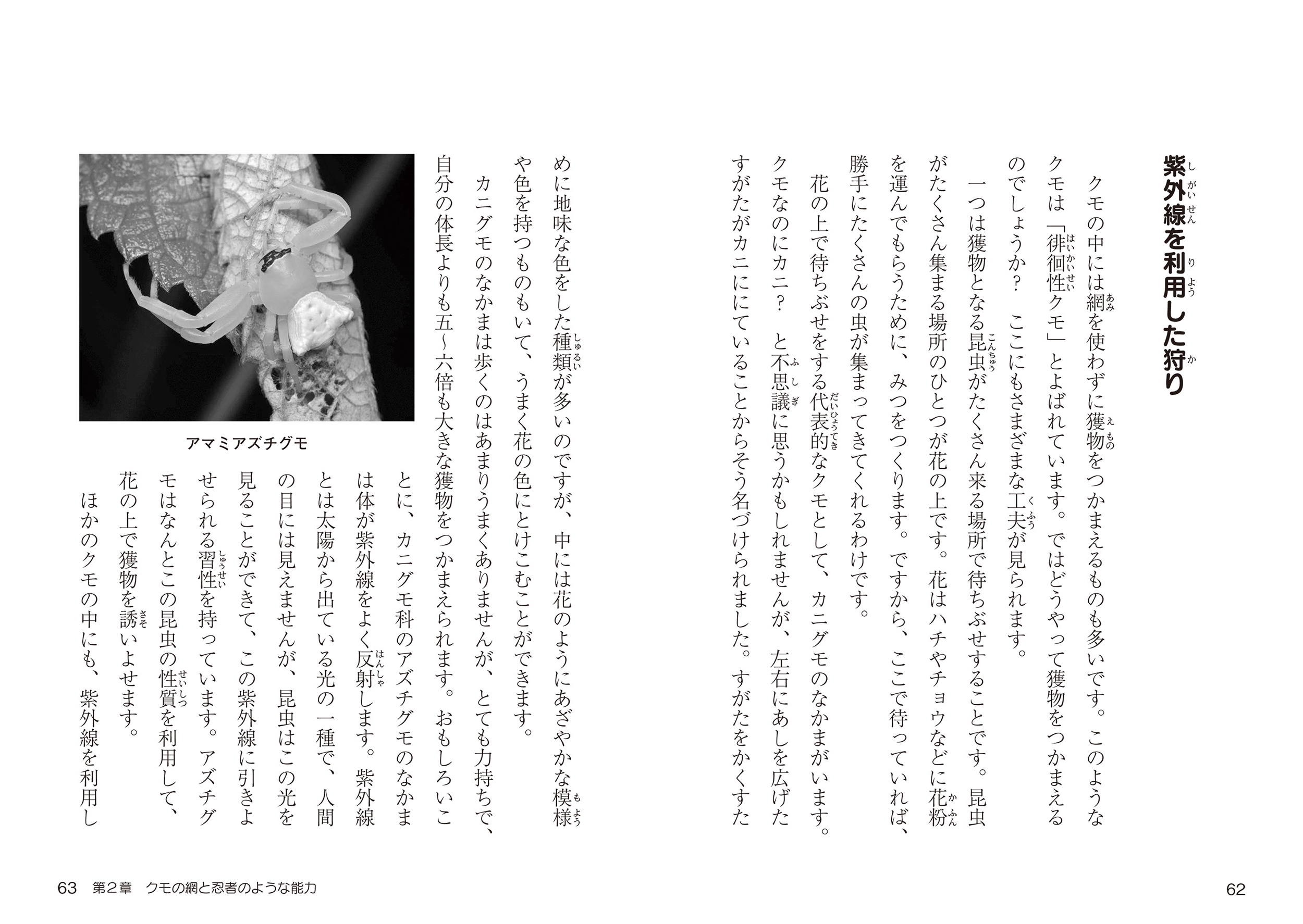 身近にいるのに知られていない「クモ」。まるで忍者のような能力や不思議な行動、暮らしぶりをご紹介。小学生からクモ好きな著者が研究者になった道のりとは……。読めば、「クモってこんなに面白い生き物だったんだ!」とびっくりすること間違いなし!