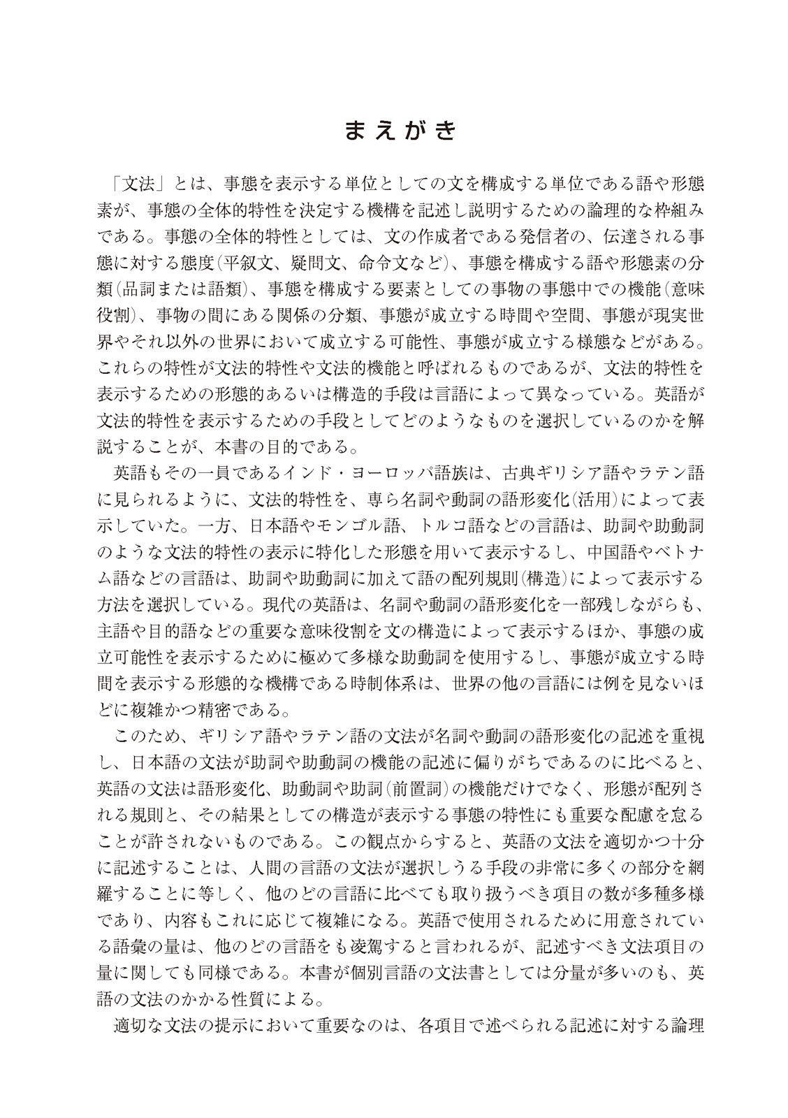 英語の言語現象を独自の新たな視点で解説する体系的・網羅的な文法書。著者の言語学的知見に基づいて当該言語の文法体系を示した既刊『フランス語文法総解説』『日本語文法総解説』と三部作をなす。これまでの研究業績を踏まえつつ、英文法の全体像を豊富な例文とともに独自の立場から構成する英文法書の決定版として、英語学習者はもちろん、英語教師や英語研究者にも得るものが多い文法書となっている。