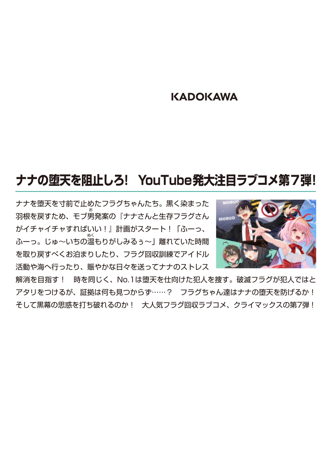 ナナの堕天を寸前で止めたフラグちゃんたち。黒く染まった羽根を戻すため、モブ男発案の『ナナさんと生存フラグさんがイチャイチャすればいい!』計画がスタート!「ふーっ、ふーっ。じゅ~いちの温もりがしみるぅ~」離れていた時間を取り戻すべくお泊まりしたり、フラグ回収訓練でアイドル活動や海へ行ったり、賑やかな日々を送ってナナのストレス解消を目指す! 時を同じく、No.1は堕天を仕向けた犯人を捜す。破滅フラグが犯人ではとアタリをつけるが、証拠は何も見つからず……? フラグちゃん達はナナの堕天を防げるか! そして黒幕の思惑を打ち破れるのか! 大人気フラグ回収ラブコメ、クライマックスの第7弾!