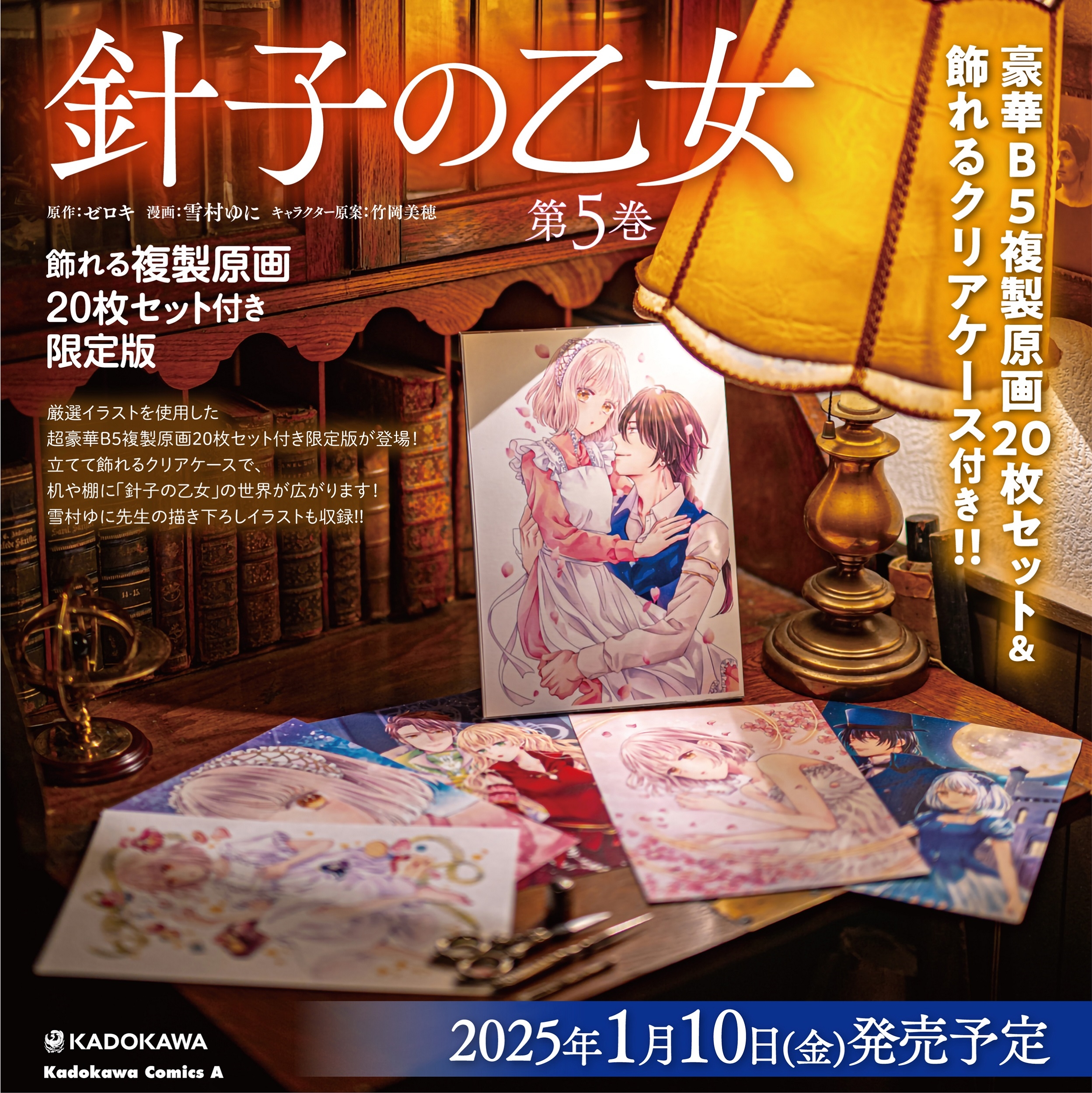 5巻では、厳選イラストを使用した超豪華B5複製原画20枚セット付き限定版が登場!! 立てて飾れるクリアケースで、机や棚に「針子の乙女」の世界が広がります! 雪村ゆに先生の描き下ろしイラストも収録!!