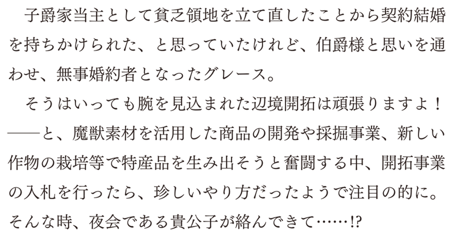 子爵家当主として貧乏領地を立て直したことから契約結婚を持ちかけられた、と思っていたけれど、伯爵様と思いを通わせ、無事婚約者となったグレース。