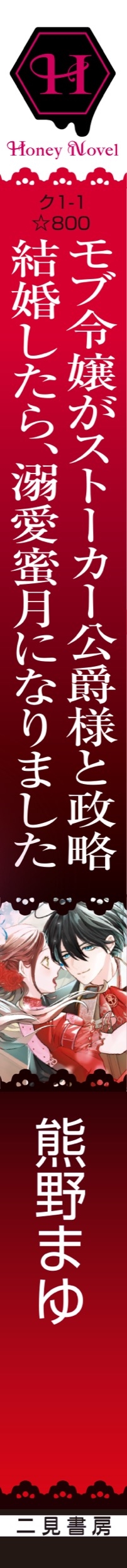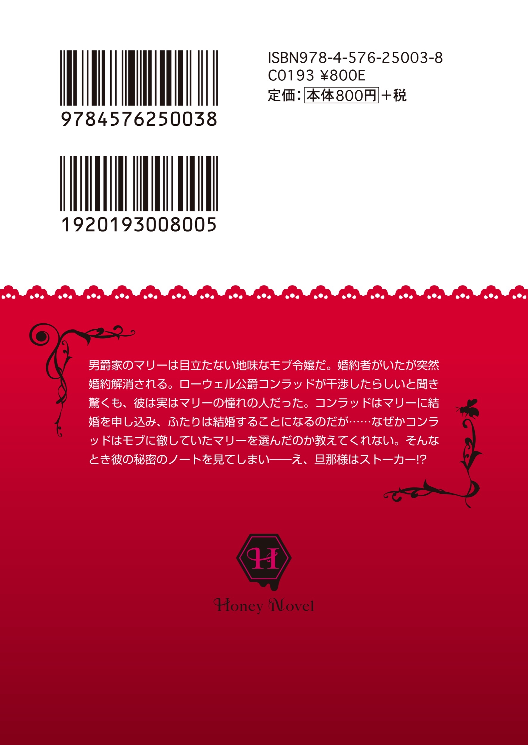 男爵家のマリーは目立たない地味なモブ令嬢だ。婚約者がいたが突然婚約解消される。ローウェル公爵コンラッドが干渉したらしいと聞き驚くも、彼は実はマリーの憧れの人だった。コンラッドはマリーに結婚を申し込み、ふたりは結婚することになるのだが…なぜか コンラッドはモブに徹していたマリーを選んだのか教えてくれない。そんなとき彼の秘密のノートを見てしまい――え、旦那様はストーカー!?
