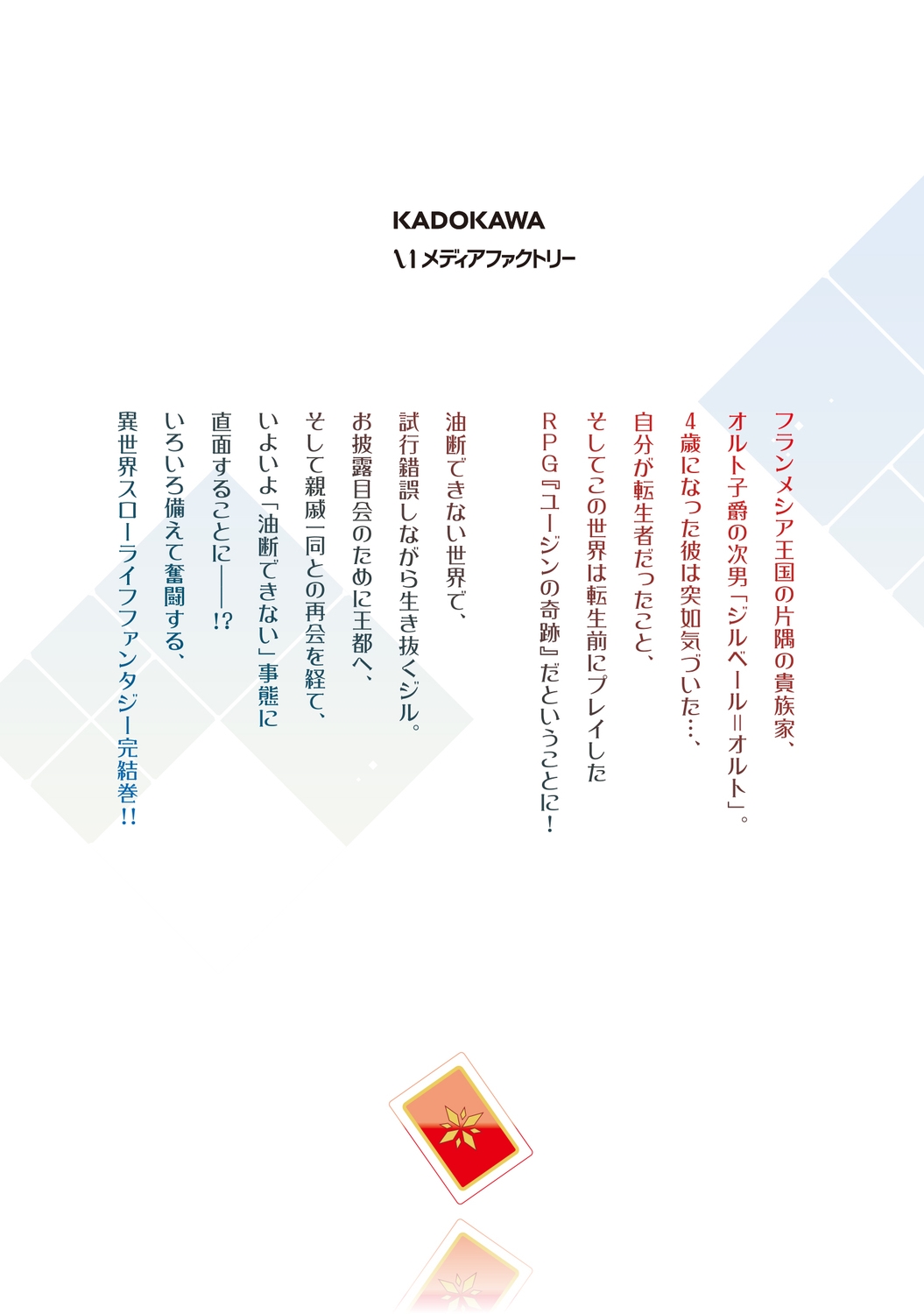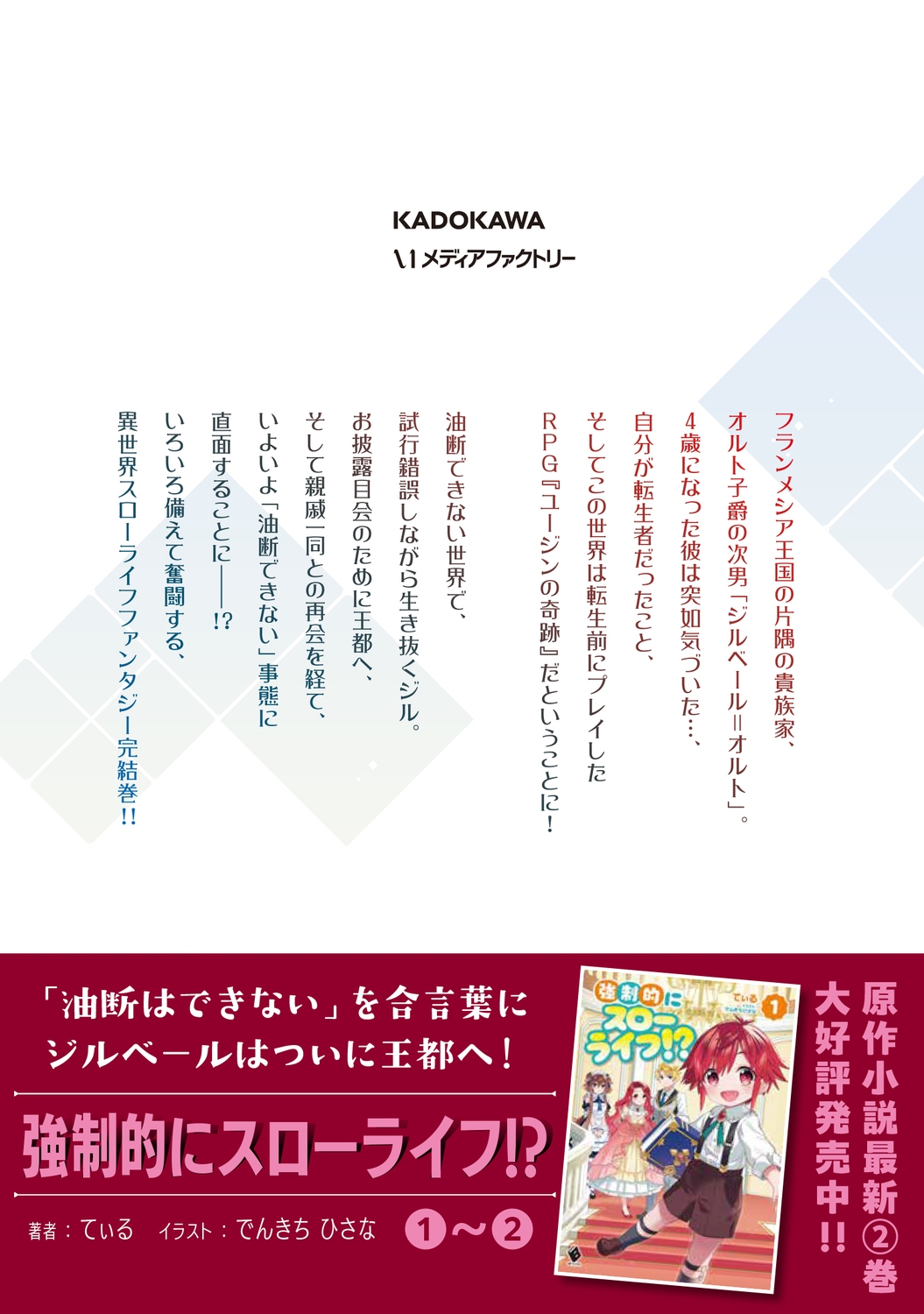 貿易都市イーリャッハを経由し、いざ王都へ。麗しいサフィーネ姫との出会いや、親族たちとの再会。その先には遂に「油断できない」難関が待ち受けていて――。大人気スローライフファンタジーコミカライズ完結巻!