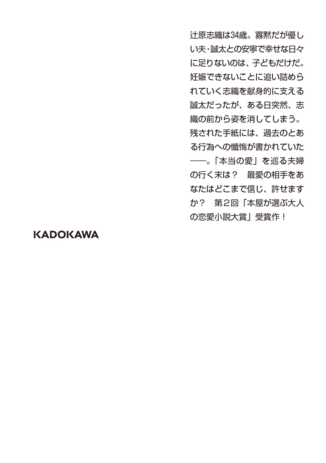 辻原志織は34歳。寡黙だが優しい夫・誠太との安寧で幸せな日々に足りないのは、子どもだけだ。妊娠できないことに追い詰められていく志織を献身的に支える誠太だったが、ある日突然、志織の前から姿を消してしまう。残された手紙には、過去のとある行為への懺悔が書かれていた――。「本当の愛」を巡る夫婦の行く末は? 最愛の相手をあなたはどこまで信じ、許せますか? 第2回「本屋が選ぶ大人の恋愛小説大賞」受賞作!