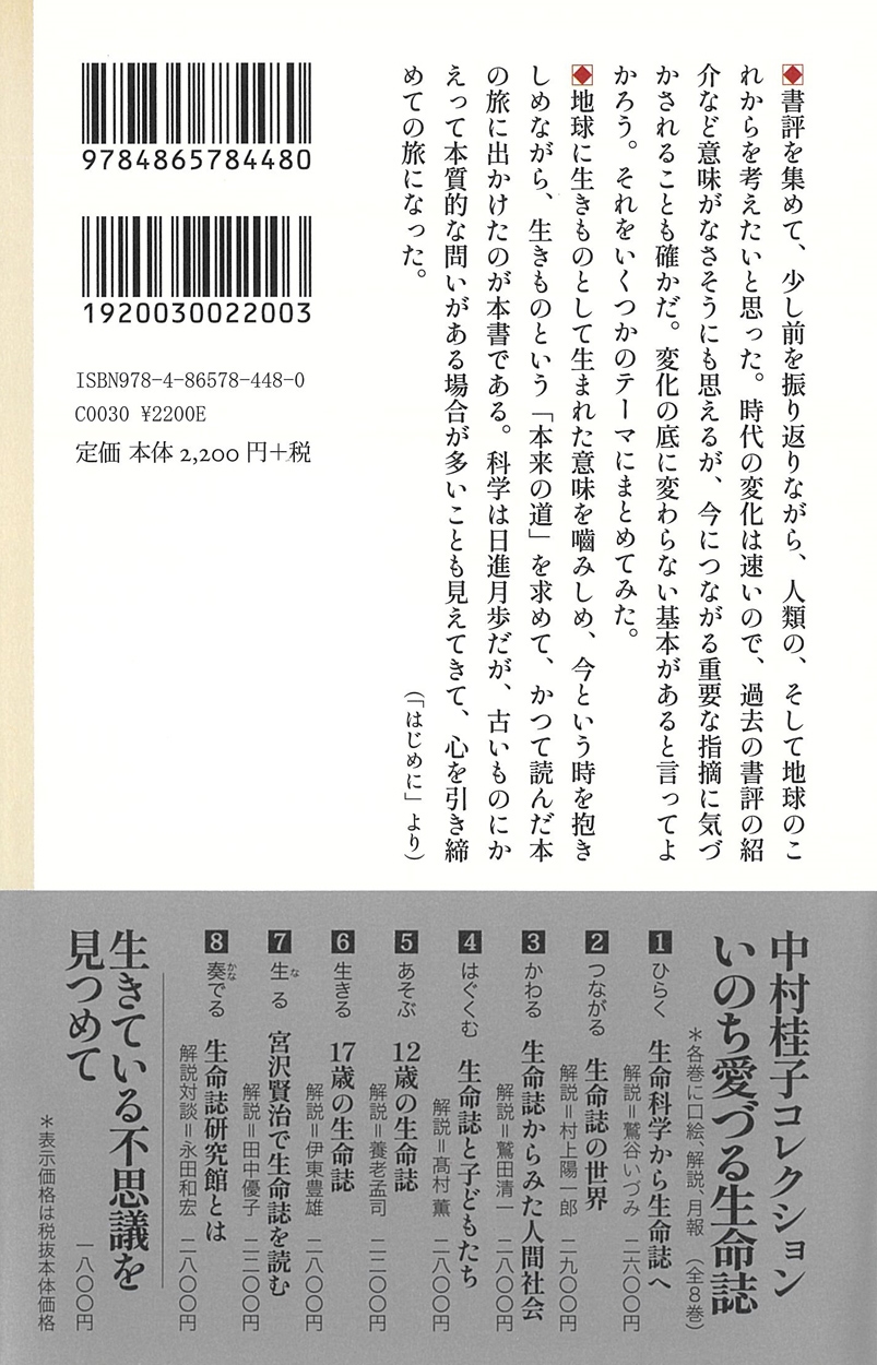 『毎日新聞』書評委員として30年以上、「生命誌(バイオヒストリー)」の観点から、科学の本にとどまらず子どもの本や文学・芸術など、人間がこれから歩いていく道を照らす多くの本を紹介してきた中村桂子さん。「科学者とは」「環境問題」「こころ」「AI」「戦争」……などのテーマ別に選りすぐった59冊を紹介する、珠玉の書評集。
