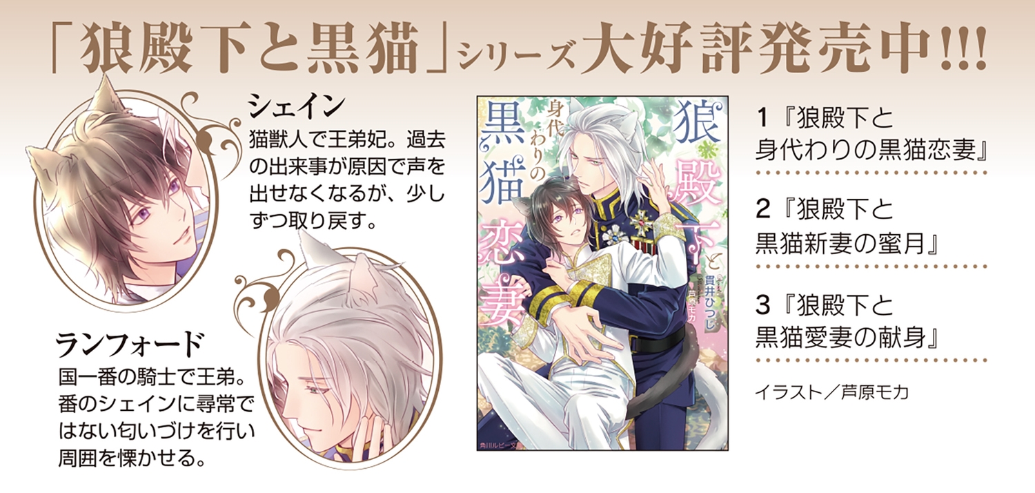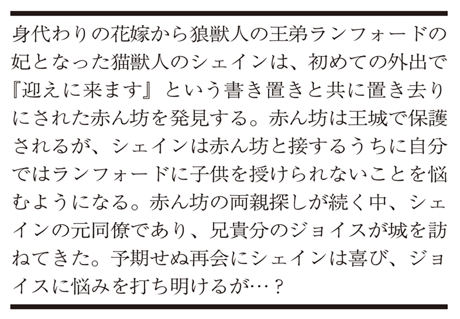 身代わりの花嫁から狼獣人の王弟ランフォードの妃となった猫獣人のシェインは、初めての外出で『迎えに来ます』という書き置きと共に置き去りにされた赤ん坊を発見する。赤ん坊は王城で保護されるが、シェインは赤ん坊と接するちに自分ではランフォードに子供を授けられないことを悩むようになる。赤ん坊の両親探しが続く中、シェインの元同僚であり、兄貴分のジョイスが城を訪ねてきた。予期せぬ再会にシェインは喜び、ジョイスに悩みを打ち明けるが…?