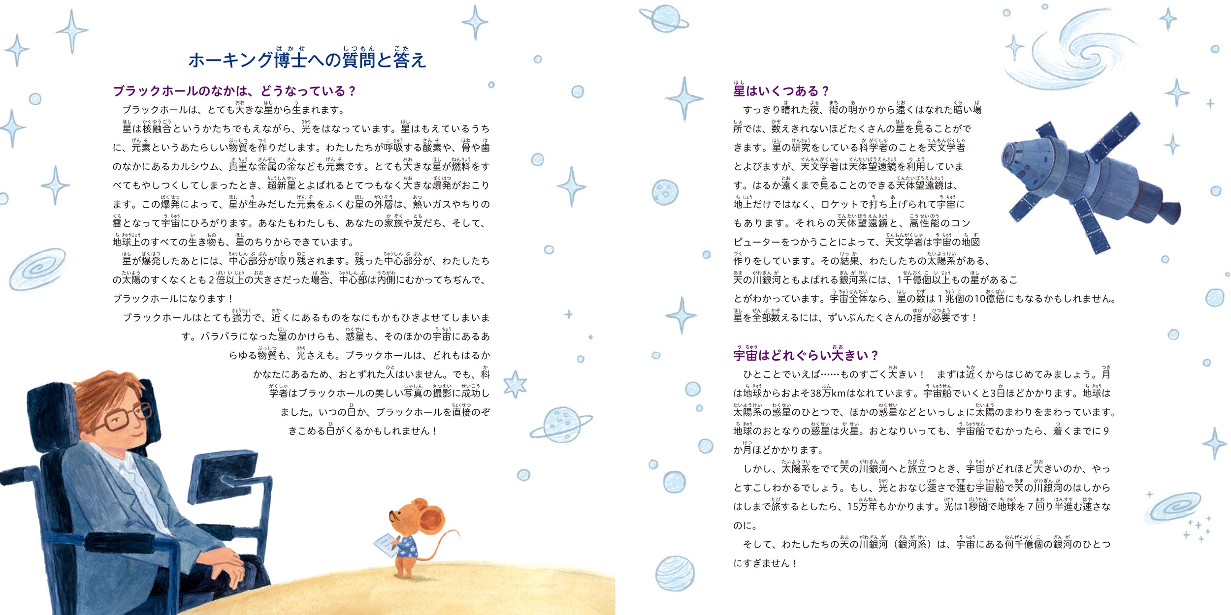 宇宙の大きさや星の数について考えたことはありますか? 地球を守るにはどうすればよいでしょう? 科学を学べば、誰もがその人なりの答えにたどり着けます。ホーキング博士から未来の科学者に贈るメッセージ。解説ページ付き。