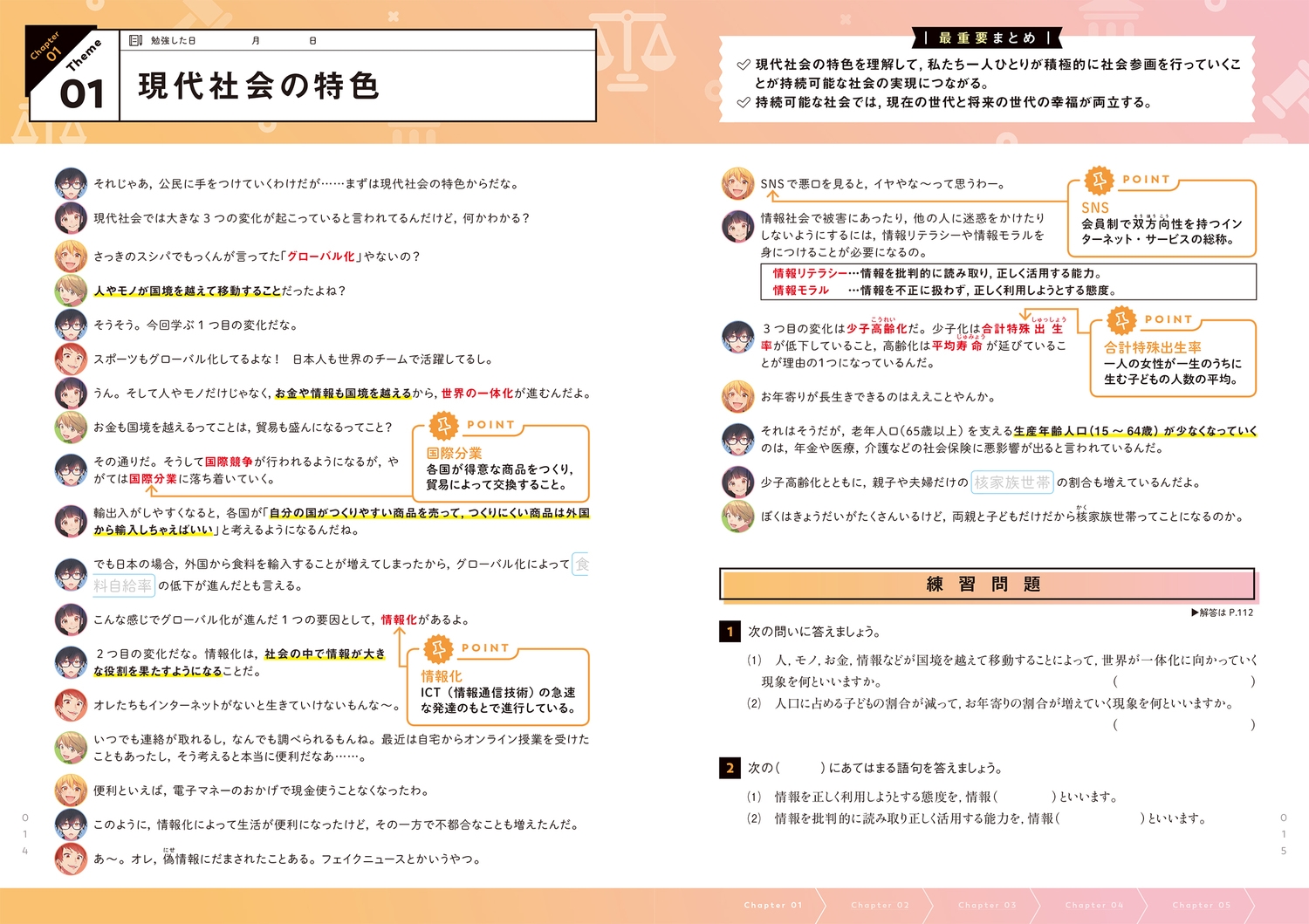 1、マンガで導入→ 2、キャラの会話でより深く理解 →3、練習問題で定着度チェックの3ステップ構成。