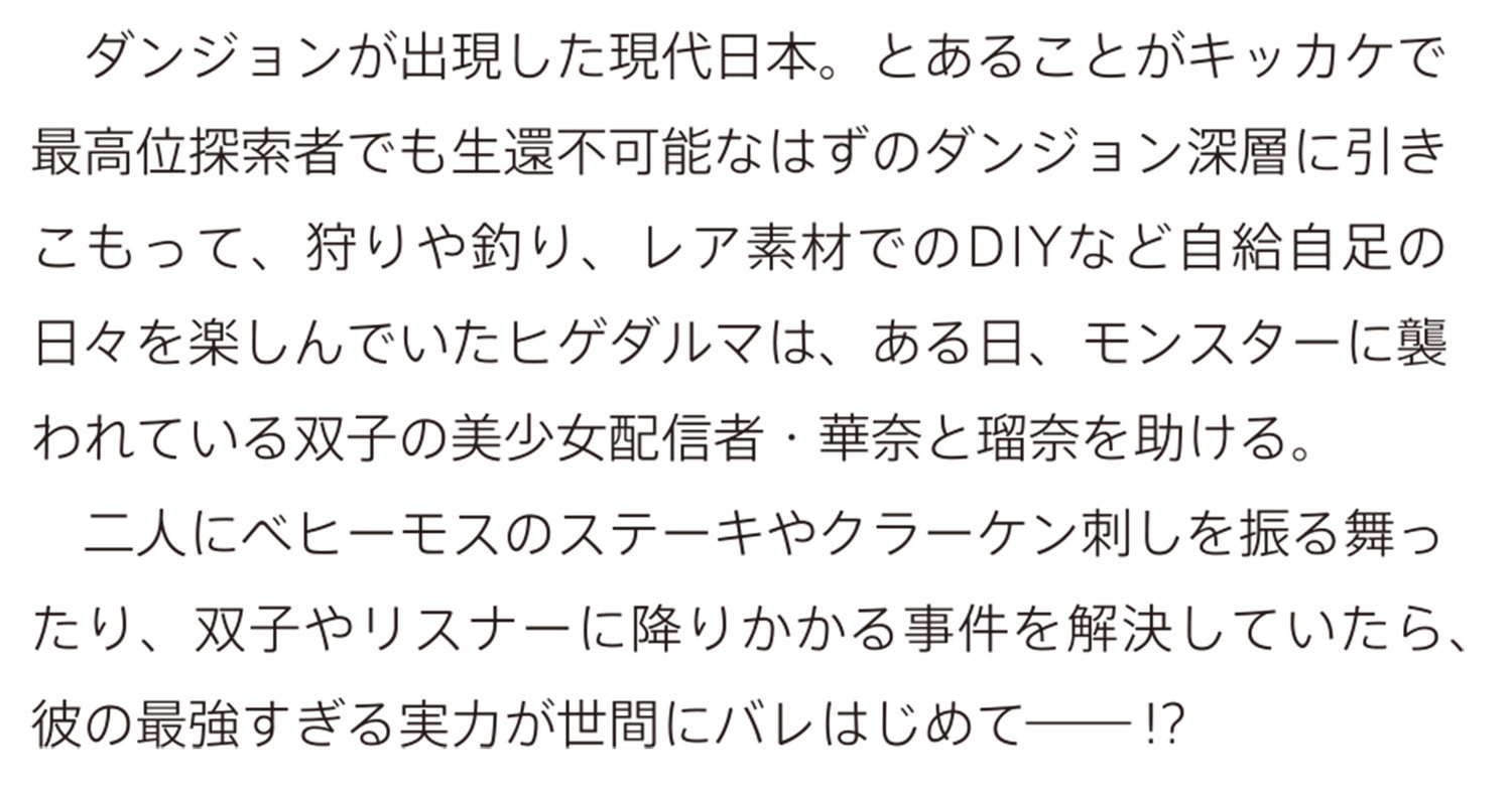 ダンジョンが出現した現代日本。とあることがキッカケで最高位探索者でも生還不可能なはずのダンジョン深層に引きこもって、狩りや釣り、レア素材でのDIYなど自給自足の日々を楽しんでいたヒゲダルマは、ある日、モンスターに襲われている双子の美少女配信者・華奈と瑠奈を助ける。