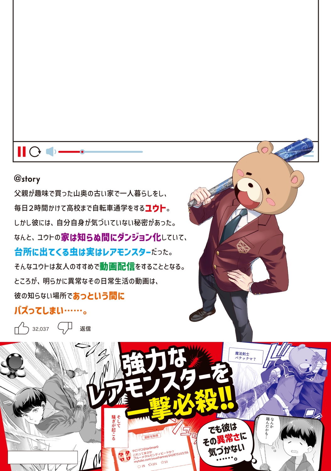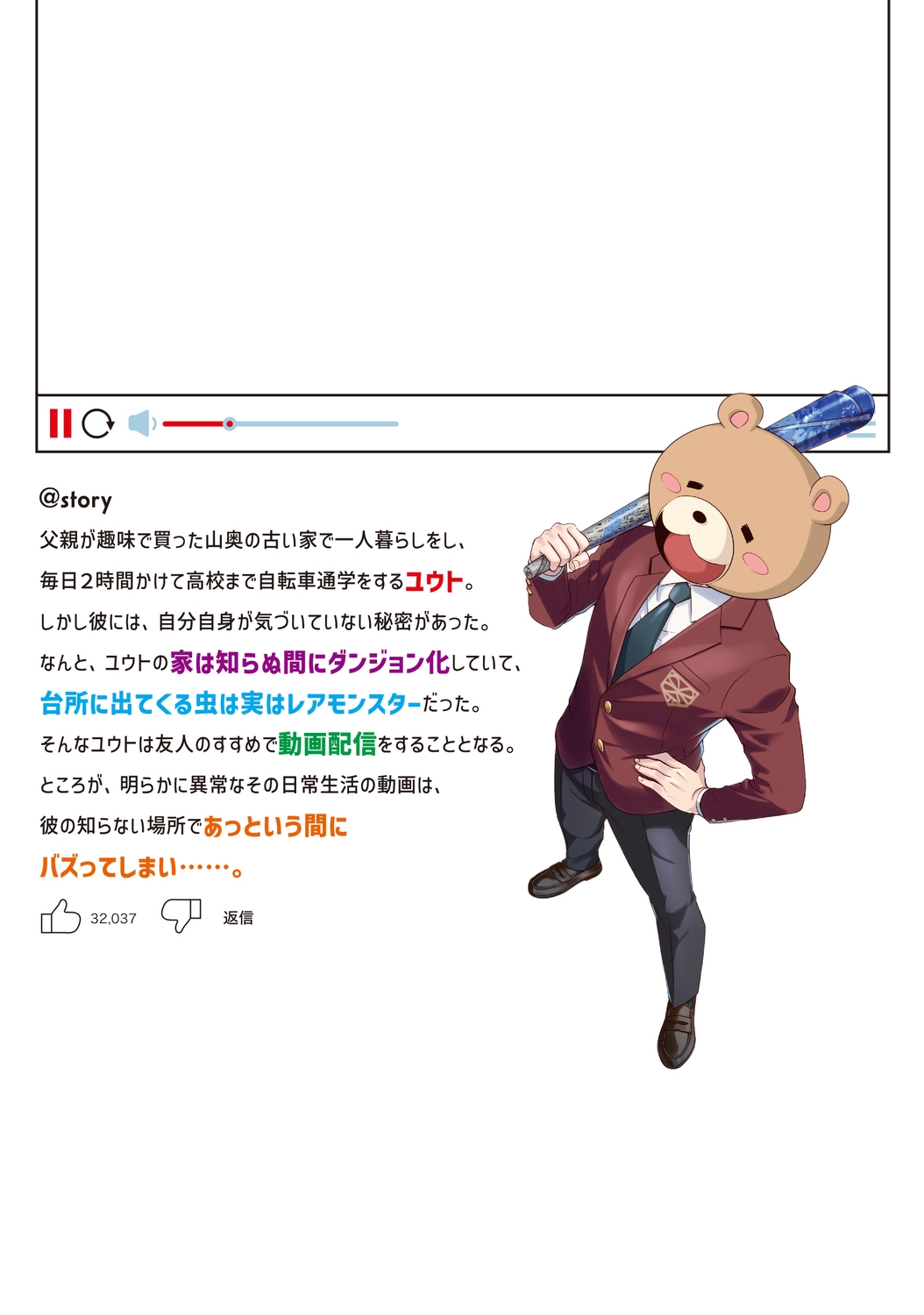 父親の趣味で山奥の古い家で独り暮らしをして、毎日二時間かけて高校まで自転車通学をするユウト。しかし彼には、自分自身が気づいていない秘密があった。なんと、ユウトの家は知らぬ間にダンジョン化していて、台所に出てくる虫は実はレアモンスターだったのだ。そんなユウトは友人のすすめで動画配信することとなる。ところが、明らかに異常なその日常生活の動画は、彼の知らない場所であっという間にバズってしまい……。