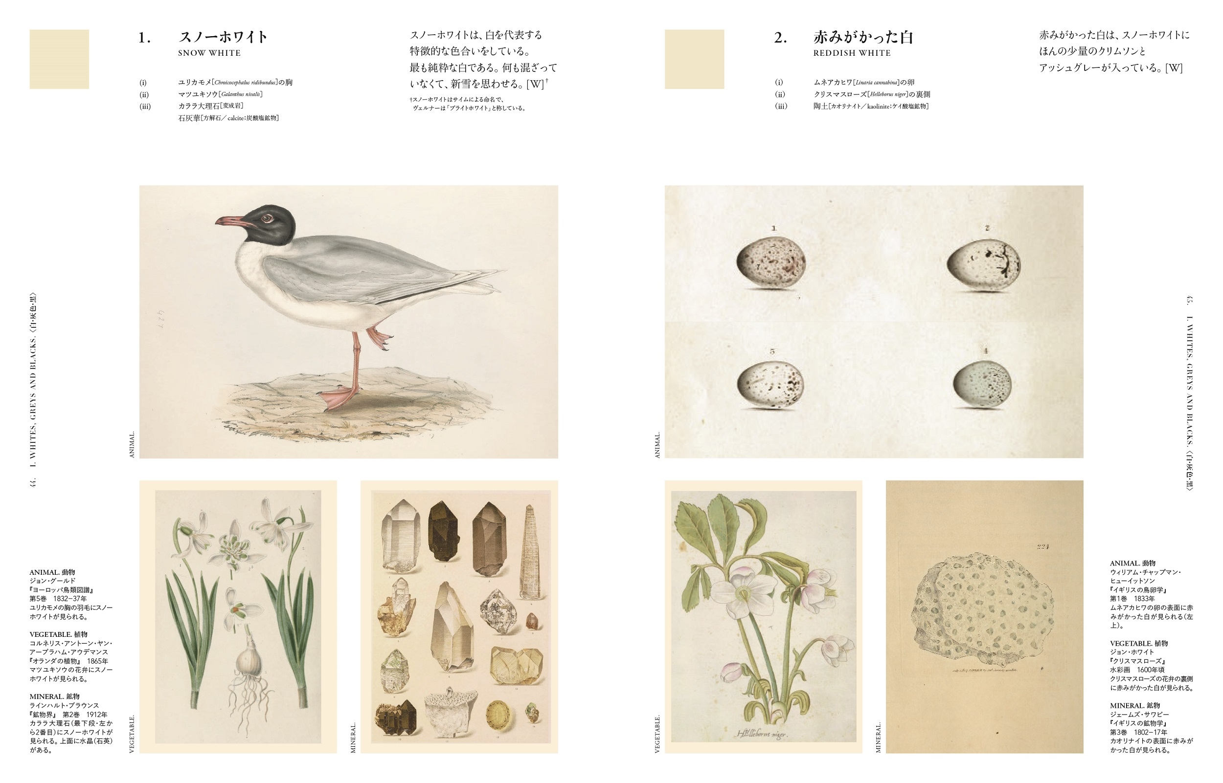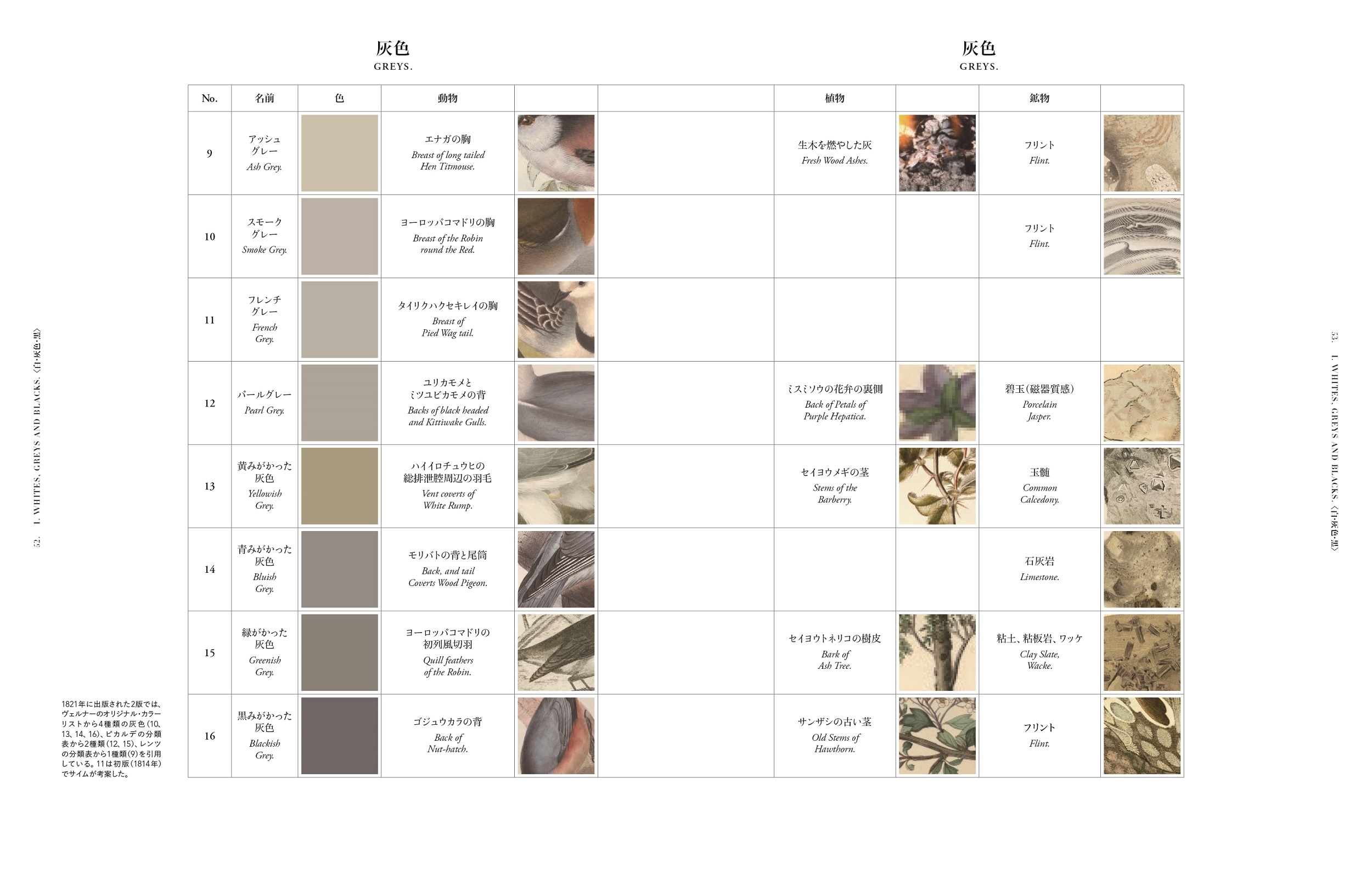 本書は、その色見本帳に掲載されていた110色に、当時の動物、植物、鉱物の博物画を添えて解説した、