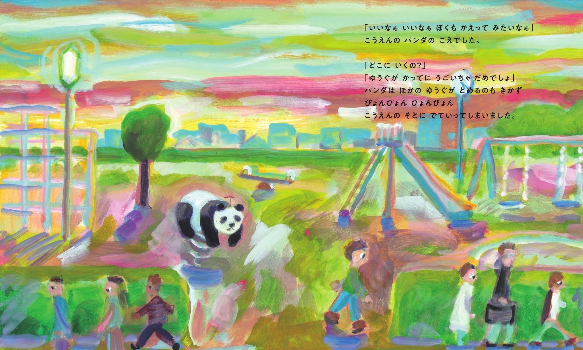 夕方、公園で遊んでいたこどもたちが家に帰っていく。遊具のパンダは他の遊具が止めるのも聞かず、ぴょんぴょんと公園外に出ていってしまいました。