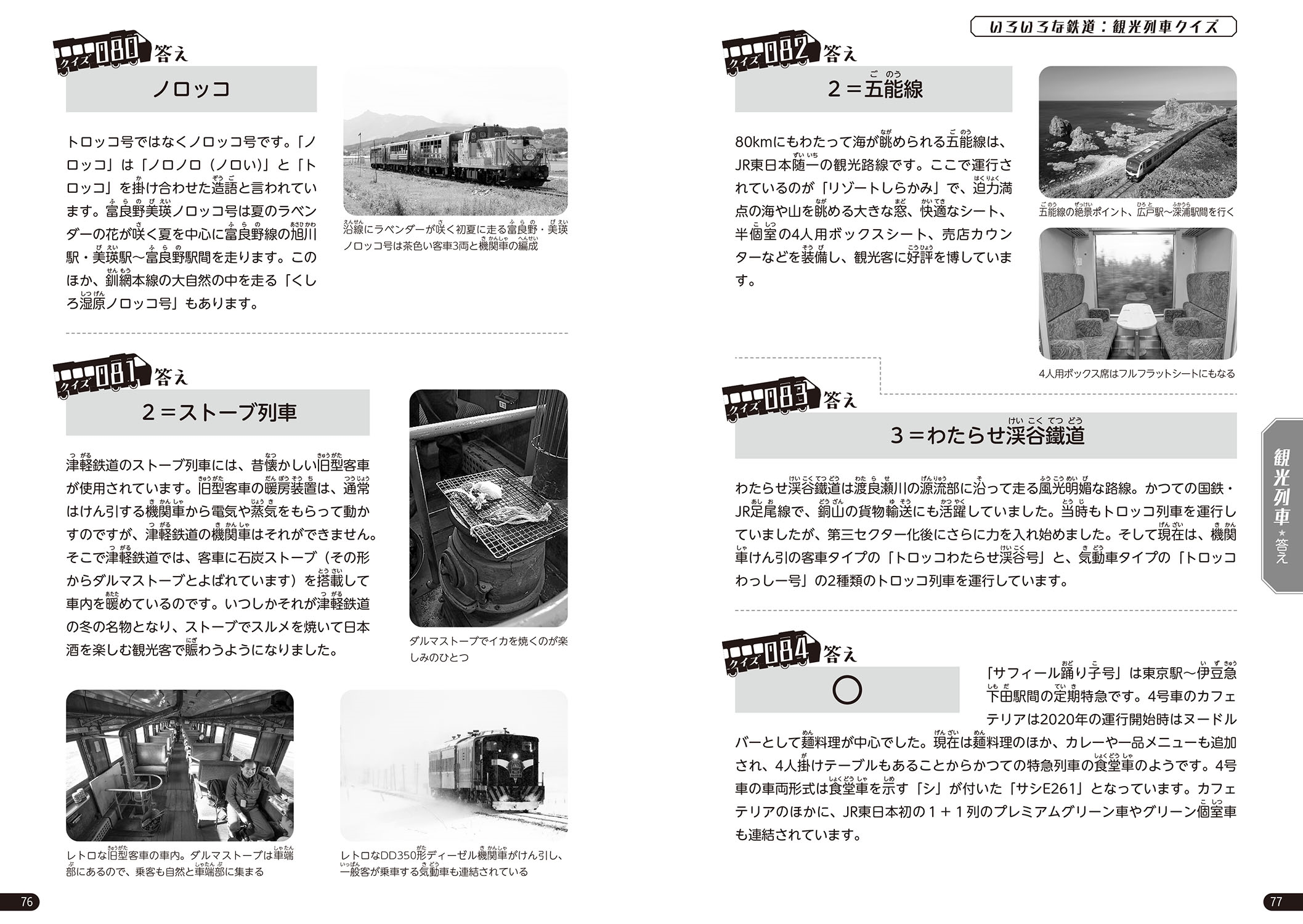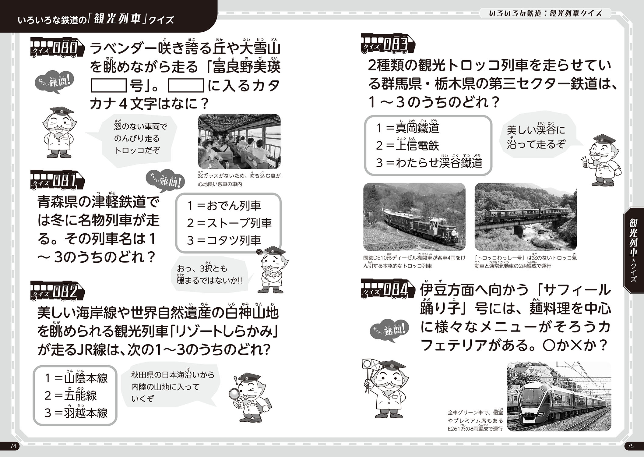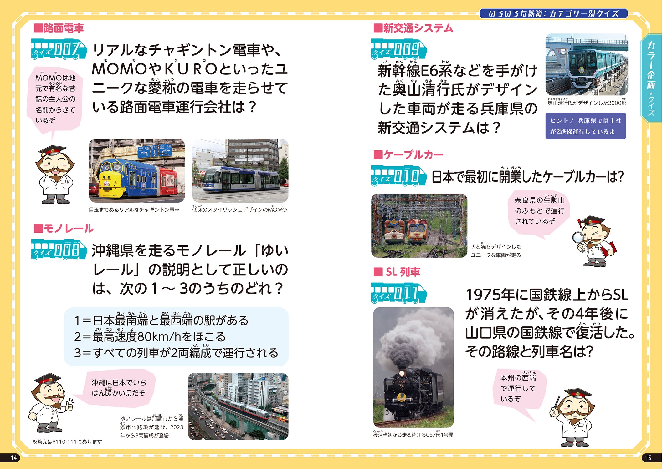 クイズ形式で楽しみながら、鉄道についての知識を深めることができるシリーズです。この3巻目では、日本全国のいろいろな鉄道を、Q&Aで取り上げます。 大都市圏鉄道、地下鉄、路面電車、モノレール、新交通システム、ケーブルカー、観光列車、SL列車、貨物列車、電気機関車&ディーゼル機関車など。鉄道の知識は、地理、歴史、技術など、いろいろなジャンル、いろいろな地域のくらしへと、興味を広げていくことができます。