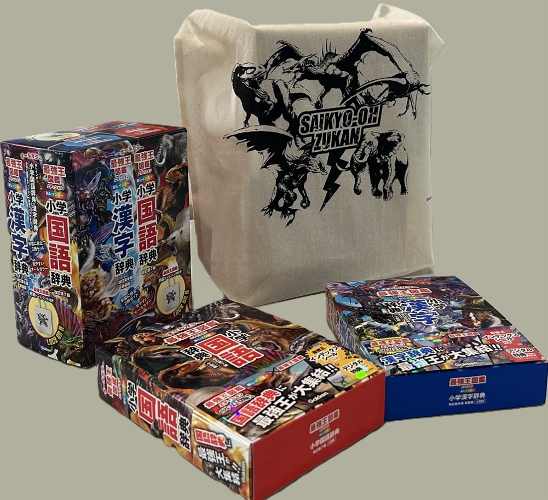 大人気の最強王図鑑キャラクターがちりばめられた『新レインボー小学国語辞典 改訂第7版 最強王図鑑エディション』と『新レインボー小学漢字辞典 改訂第6版新装版 最強王図鑑エディション』の2冊を専用ケースに入れたセット。最強王図鑑デザインの辞書バッグつき!