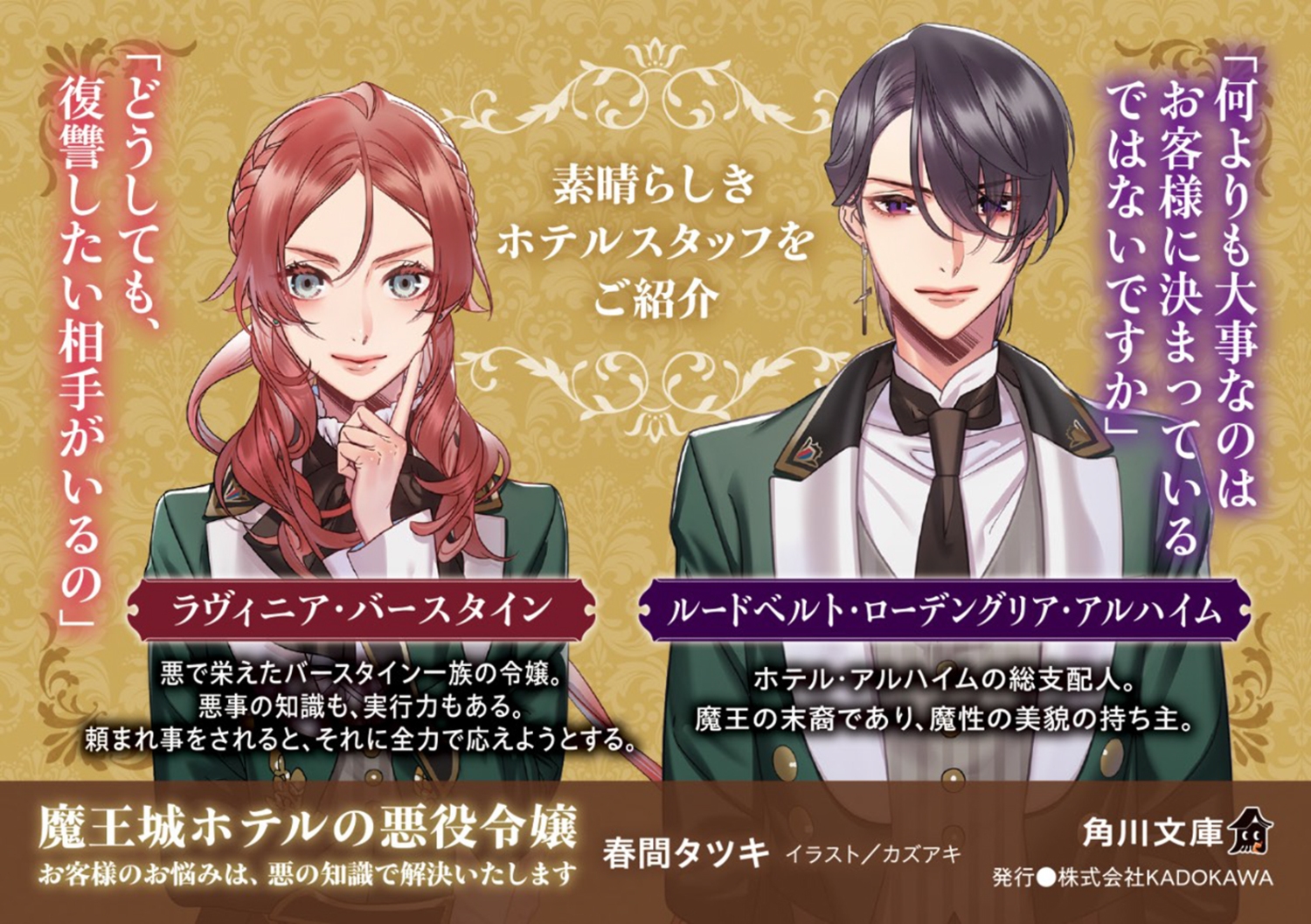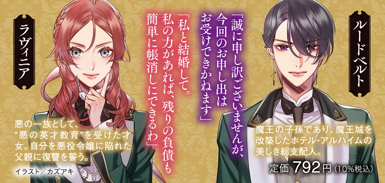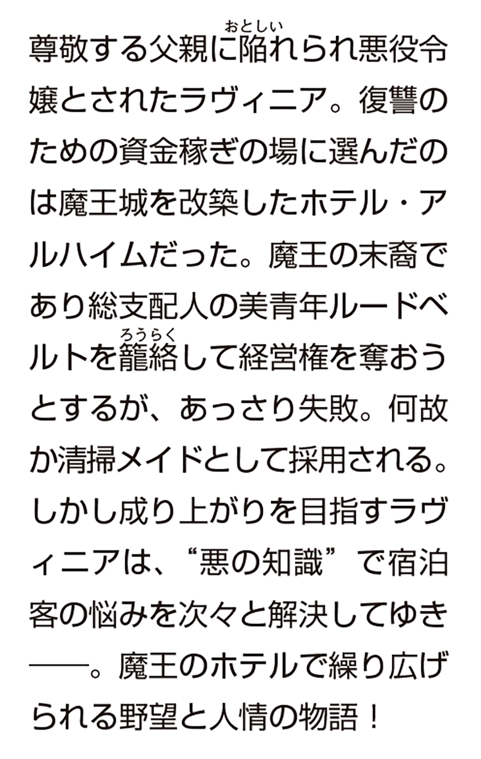 尊敬する父親に陥れられ悪役令嬢とされたラヴィニア。復讐のための資金稼ぎの場に選んだのは魔王城を改築したホテル・アルハイムだった。魔王の末裔であり総支配人の美青年ルードベルトを篭絡して経営権を奪おうとするが、あっさり失敗。何故か清掃メイドとして採用される。しかし成り上がりを目指すラヴィニアは、"悪の知識"で宿泊客の悩みを次々と解決してゆき――。魔王のホテルで繰り広げられる野望と人情の物語!