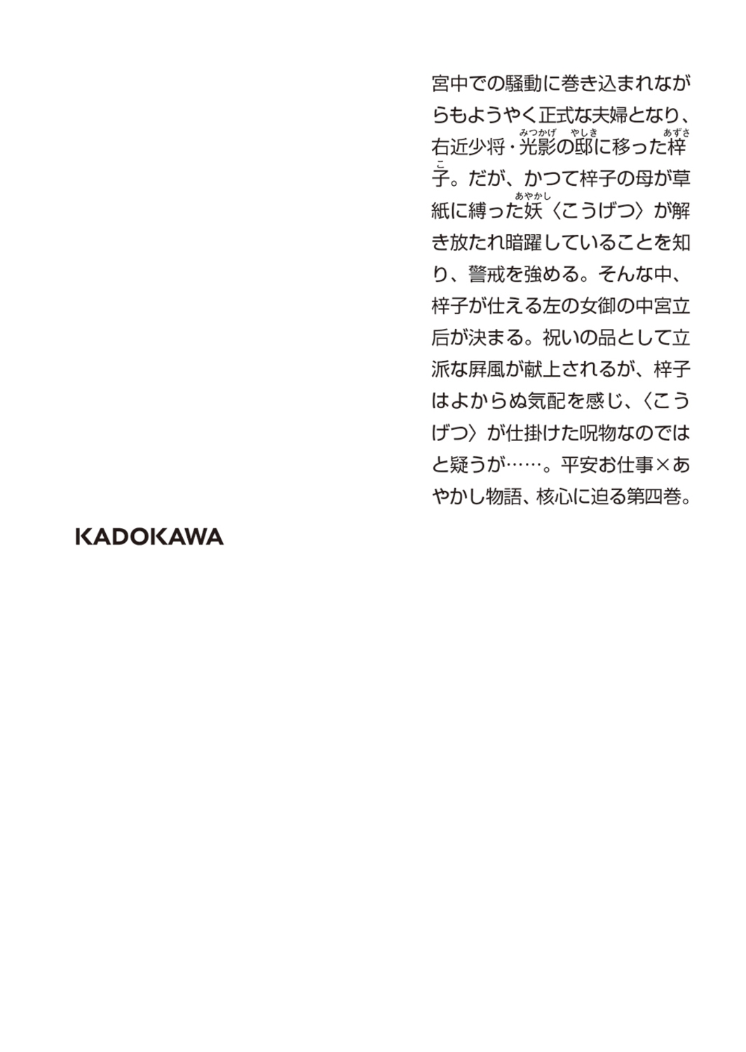 だが、かつて梓子の母が草紙に封じたはずのあやかし「こうげつ」が解き放たれ、宮中で暗躍していることも知る。