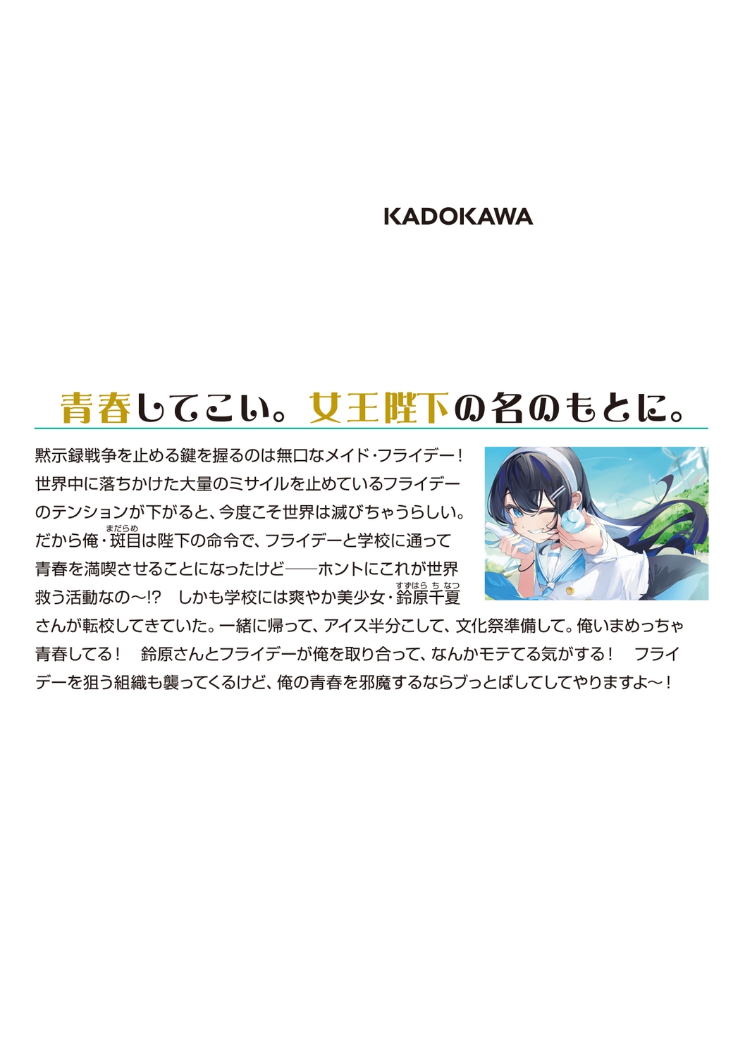 黙示録戦争を止める鍵を握るのは無口なメイド・フライデー! 世界中に落ちかけた大量のミサイルを止めているフライデーのテンションが下がると、今度こそ世界は滅びちゃうらしい。だから俺・斑目は陛下の命令で、フライデーと学校に通って青春を満喫させることになったけど──ホントにこれが世界救う活動なの~!? しかも学校には爽やか美少女・鈴原千夏さんが転校してきていた。一緒に帰って、アイス半分こして、文化祭準備して。俺いまめっちゃ青春してる! 鈴原さんとフライデーが俺を取り合って、なんかモテてる気がする! フライデーを狙う組織も襲ってくるけど、俺の青春を邪魔するならブっとばしてしてやりますよ~!