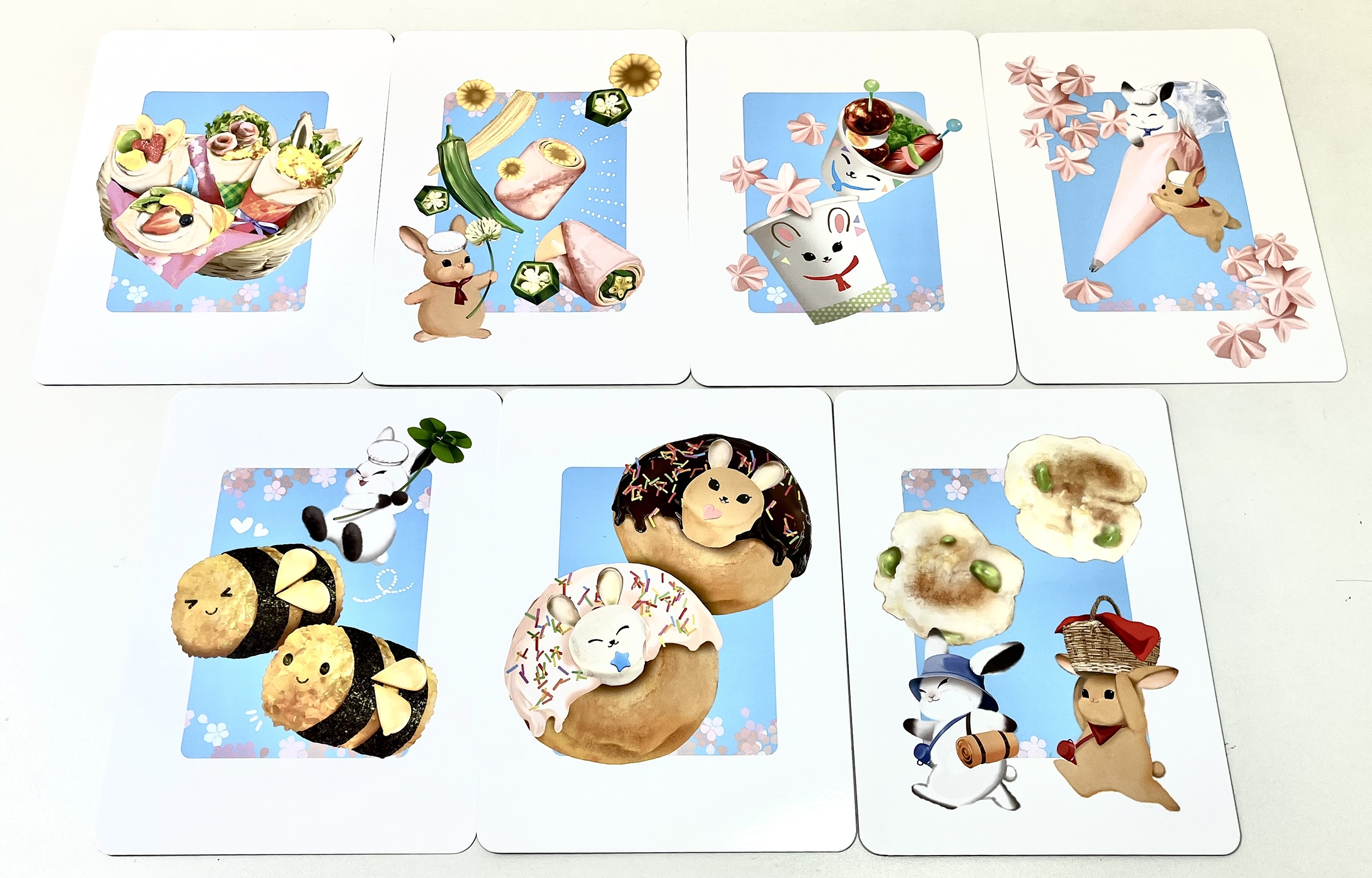 7枚のカラフルでかわいいレシピカードには、イラストとわかりやすいレシピが記載されており、初心者でも簡単に作れます。材料の分量や作り方の「ごちそうのコツ」が詳しく説明されており、ふりがな付きで親子で楽しくお料理できる内容です。