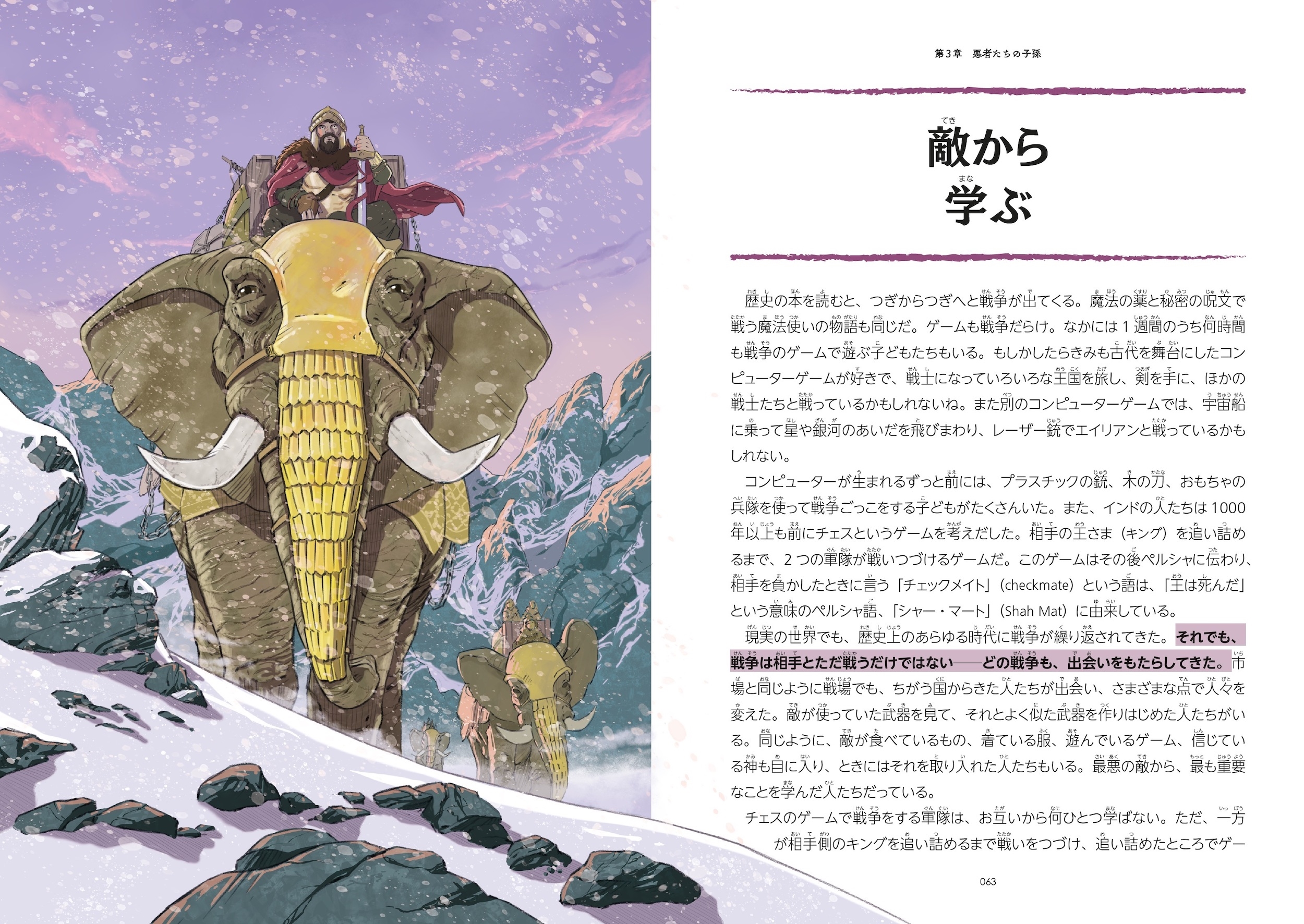 (中略)たとえば、もしきみが、外国語を話して変わった食べものを食べる遠い国の人と会うと、何が起きるだろうか? もしきみが、海をわたってどこかの見知らぬ場所にたどり着いたとしたら、何が起きるだろう? けんかになるのかな? それともうまくやっていけるのかな? お互いにまったくちがう人どうしは、どうすれば力をあわせたり友だちになったりできるんだろう?」