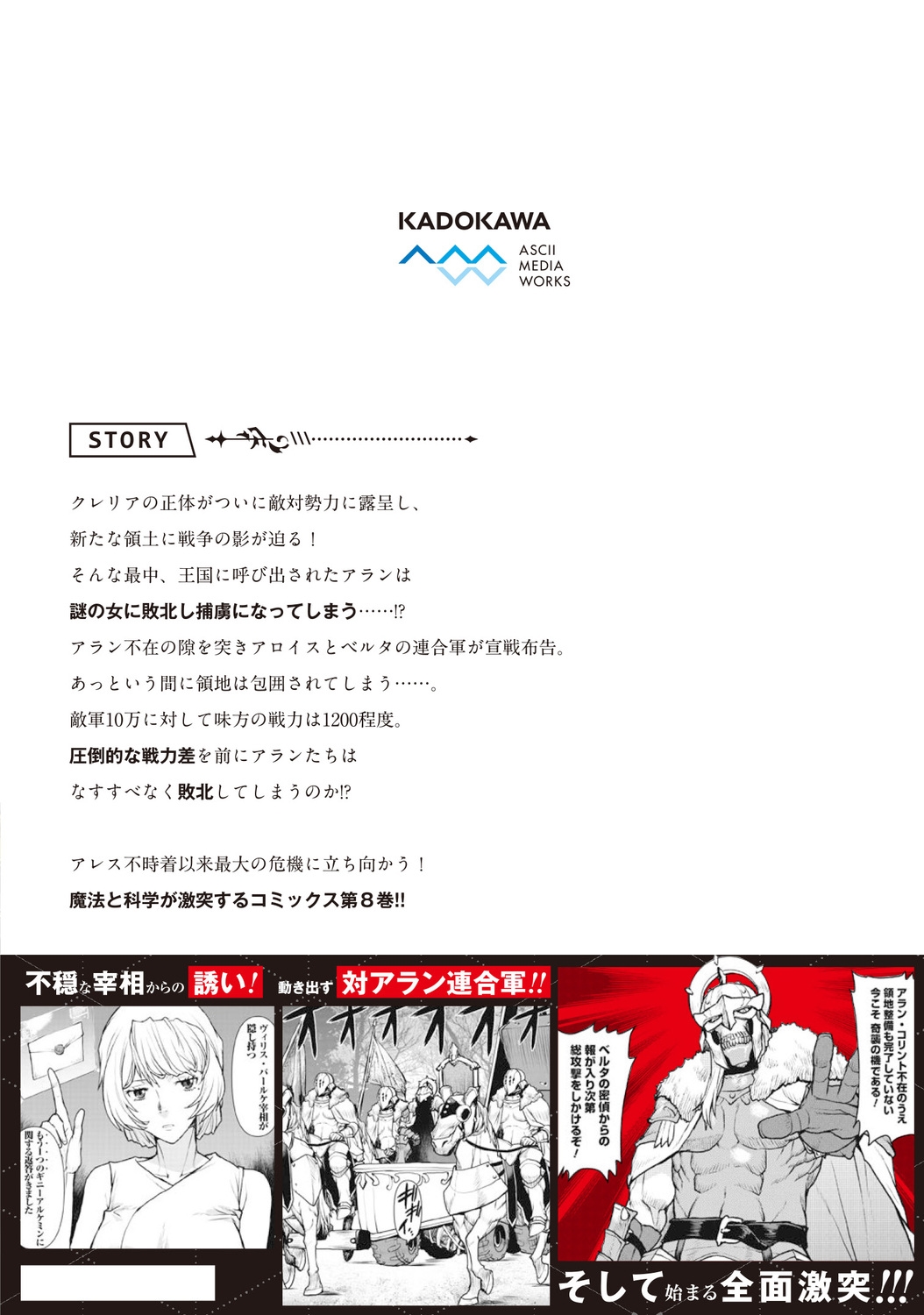 クレリアの正体がついに敵対勢力に露呈し、新たな領土に戦争の影が迫る! そんな最中、王国に呼び出されたアランは帝国の技術に精通した謎の女に敗北し、捕虜になってしまう……!!