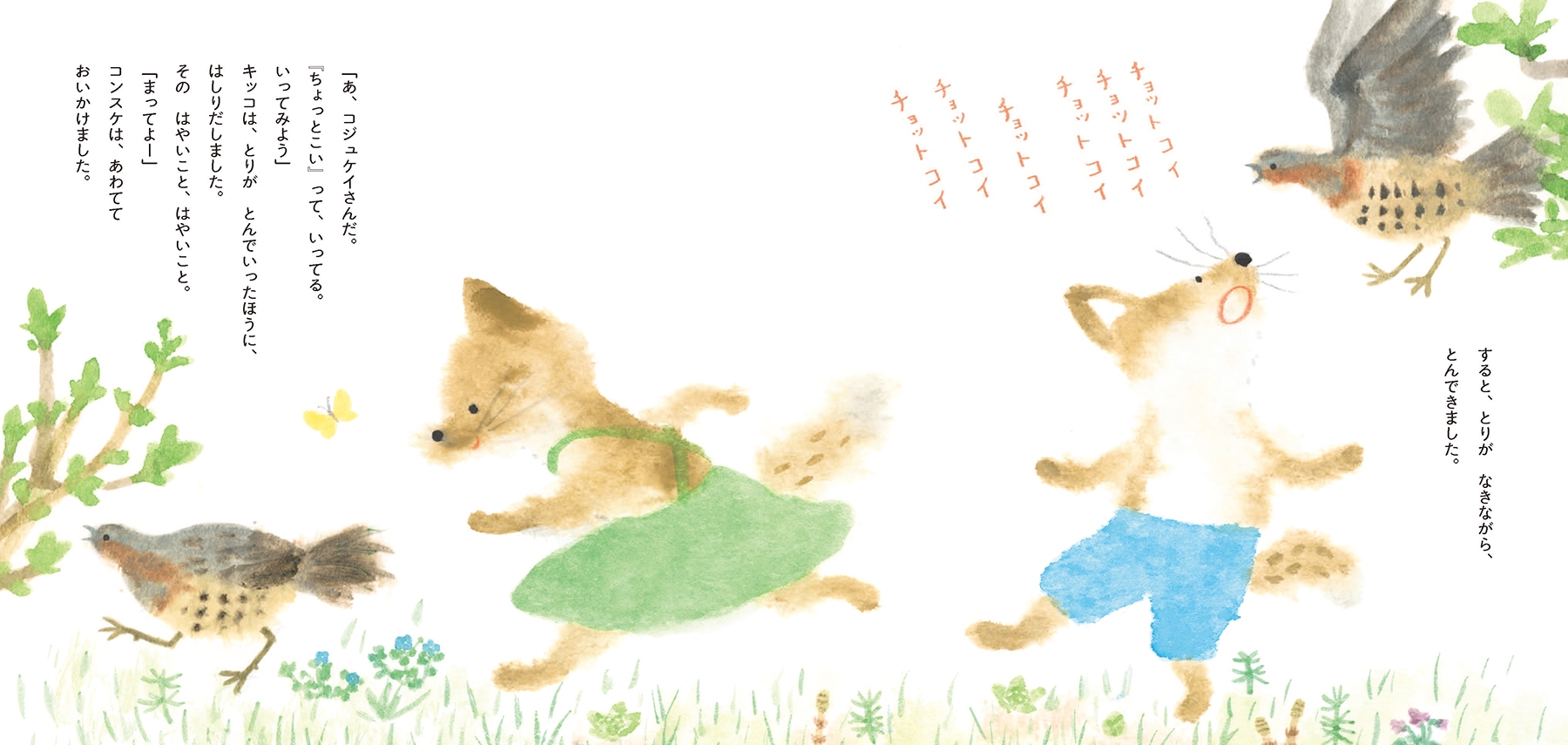はるのもりで、きつねのコンスケはキッコちゃんと出会いました。コンスケは、キッコちゃんから鳥のことばを教えてもらって・・・。