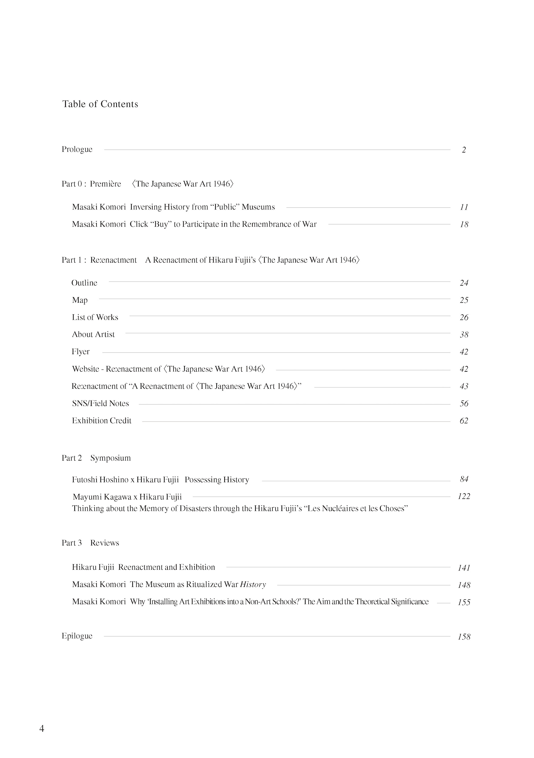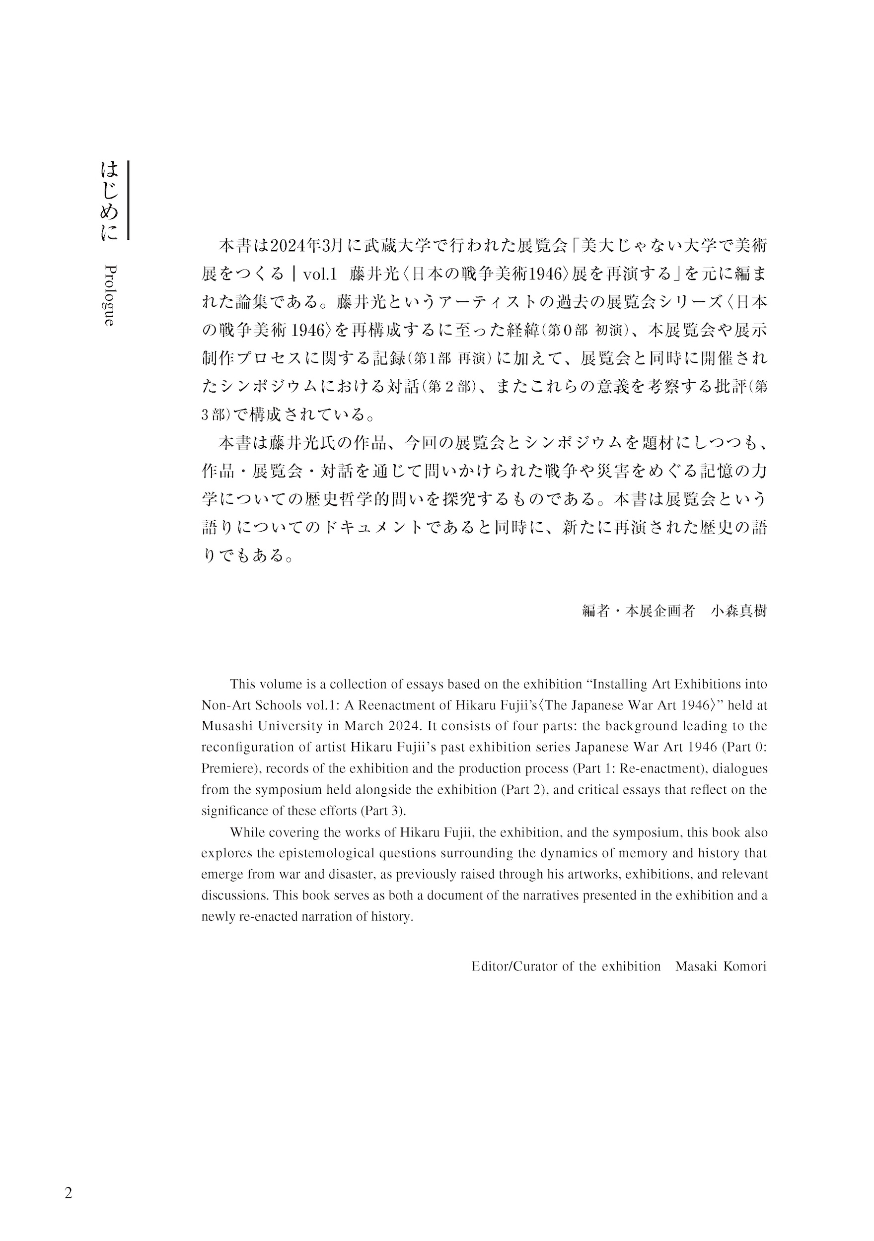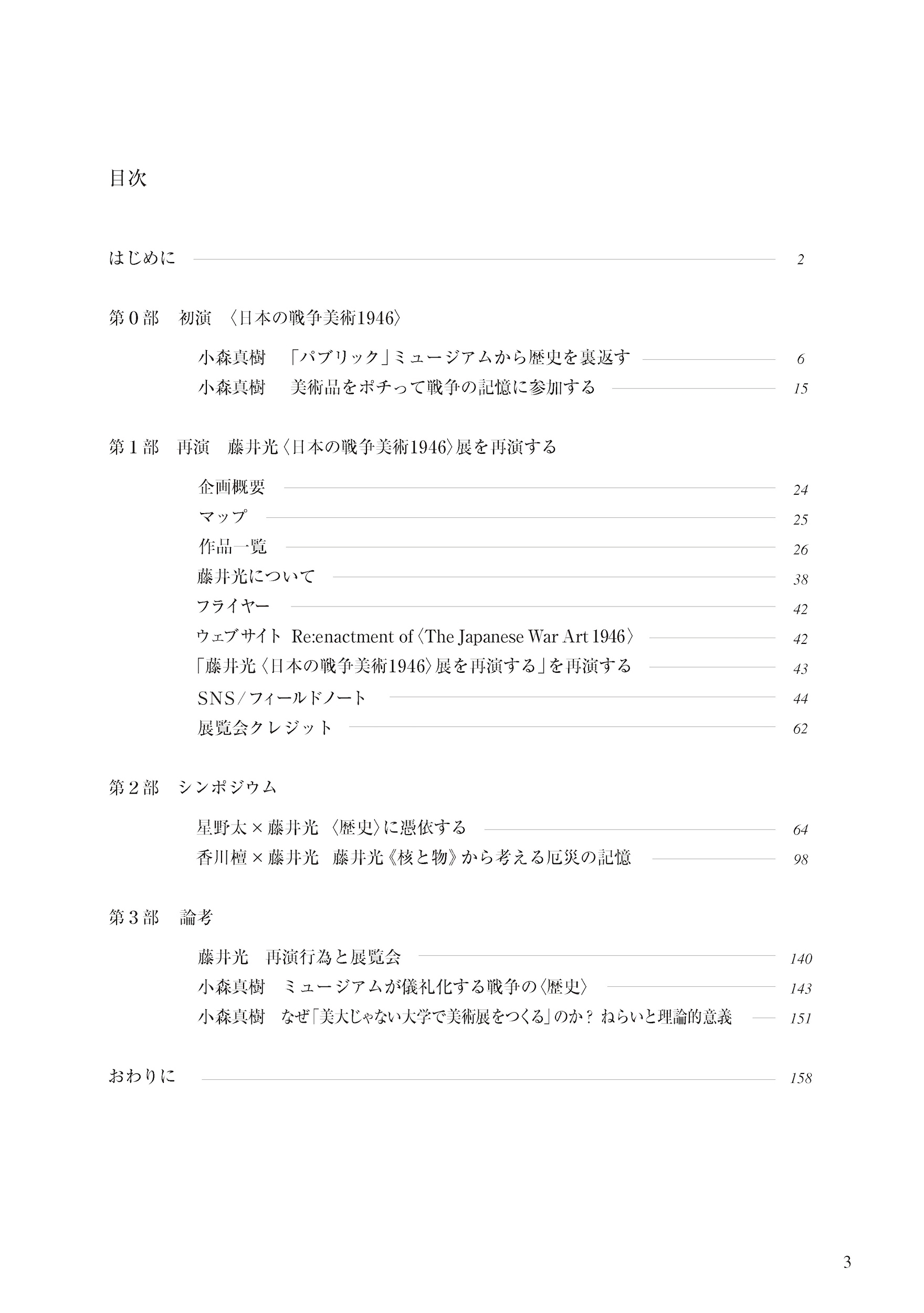 本書には、先行する2つの〈日本の戦争美術〉展の解題にはじまり、武蔵大学の展覧会に至る経緯、展示作品、催されたシンポジウム(登壇者:藤井光、星野太、香川檀)の記録、さらには小森真樹と藤井光による論考を収録。「藤井光〈日本の戦争美術1946〉」展の作品・展覧会・議論を起点に生まれた、戦争や災害を通じた記憶の力学についての歴史哲学的問いを探究するものである。つまり本書は展覧会ドキュメントであると同時に、書籍というかたちで新たに「再演」された歴史の語りでもある。