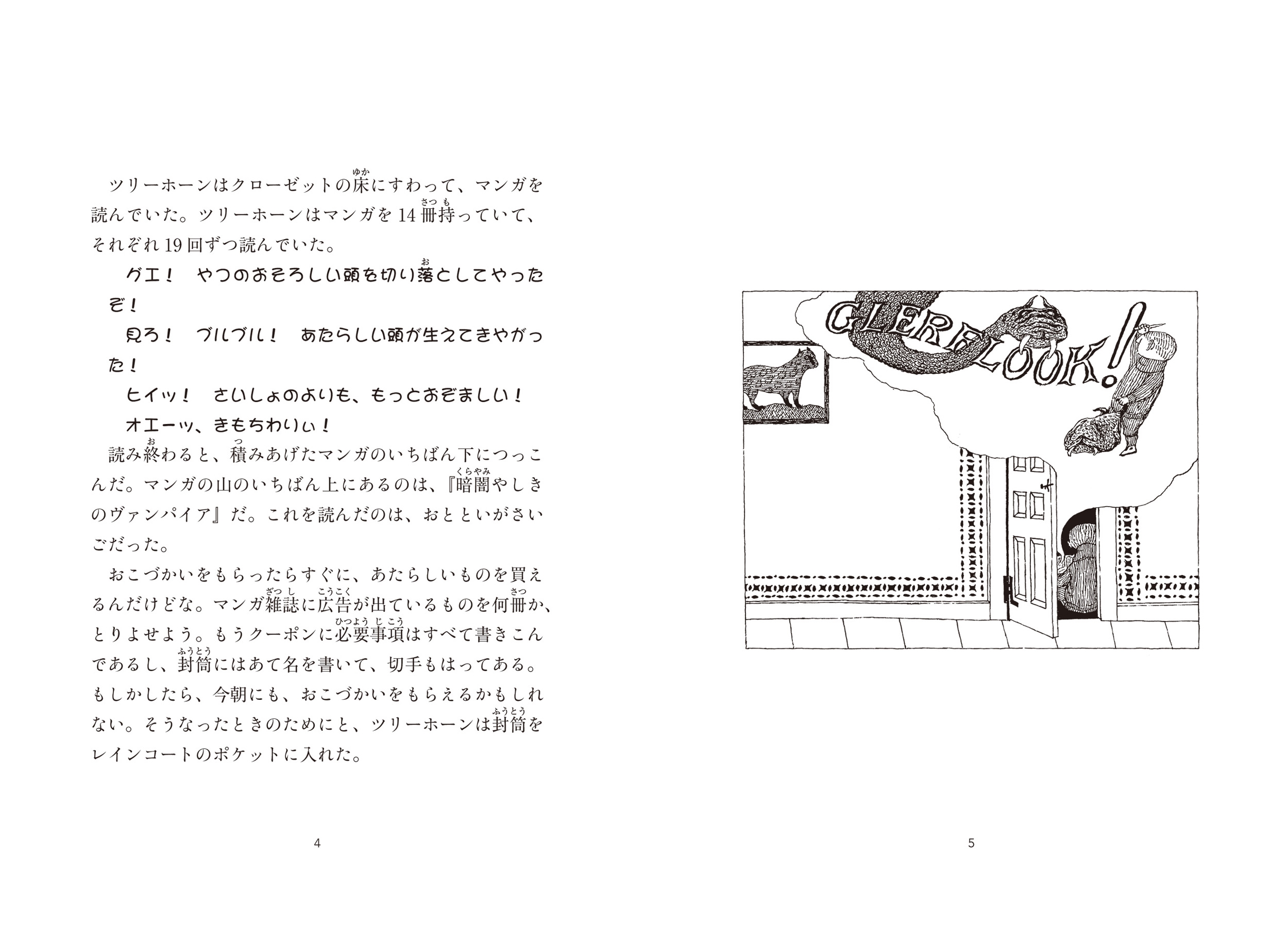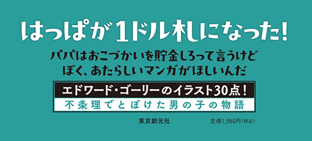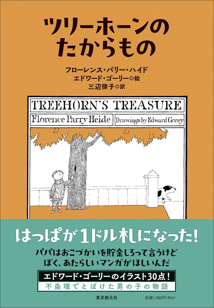 ツリーホーンはマンガを14冊持っていて、それぞれ19回ずつ読んでいた。おこづかいをもらえたら、新しいのを買うんだ。でもおとうさんは貯金しろっていう。ただ貯めたって意味がないのに……。おとうさんは「金のなる木はない」っていうけど、庭に出てみたら、はっぱが1ドル札になっていた! 英国児童文学の人気作家フローレンス・パリー・ハイドとイラストレーター、エドワード・ゴーリーがタッグを組んだナンセンスで可愛い物語。