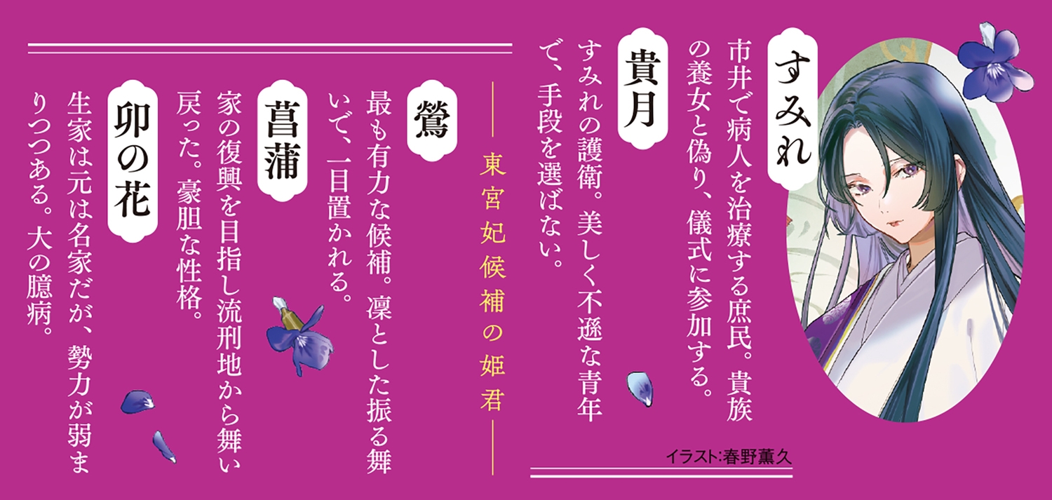 疫病が蔓延する市井で治療に携わるすみれは、美しい貴族の青年・貴月を助け見いだされる。