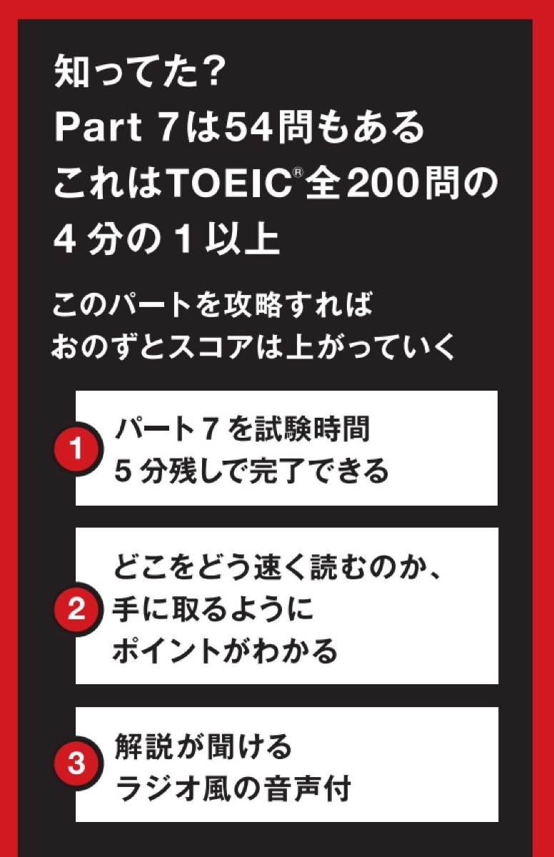 …にもかかわらず、多くの受験者が試験時間内に最後まで解き切れない。逆に言えば、「パート7」の鬼退治こそがTOEICハイスコア獲得の最短ルートなのです。730点~満点も狙える!