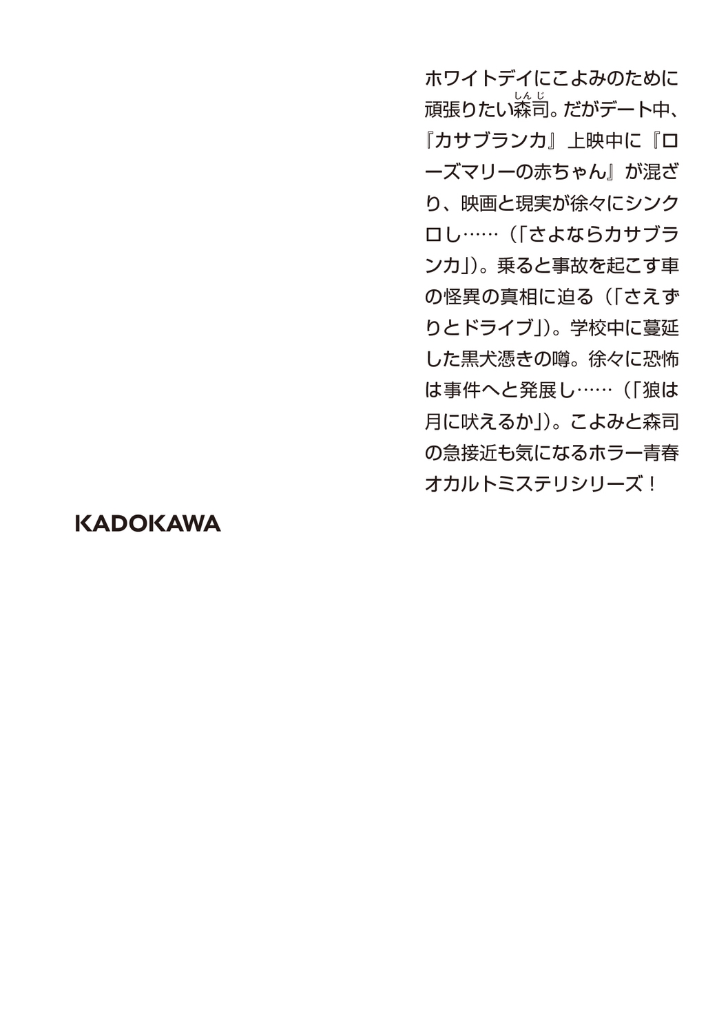 第一話 ホワイトデイにこよみのために頑張りたい森司。だがデート中の『カサブランカ』上映中に、先週上映したはずの『ローズマリーの赤ちゃん Rosemary's Baby (1968年)』が混ざる怪異に。映画の世界と現実が徐々にシンクロし、どうやら出ると言われている2階のバーと関連しているとわかるのだが…。
