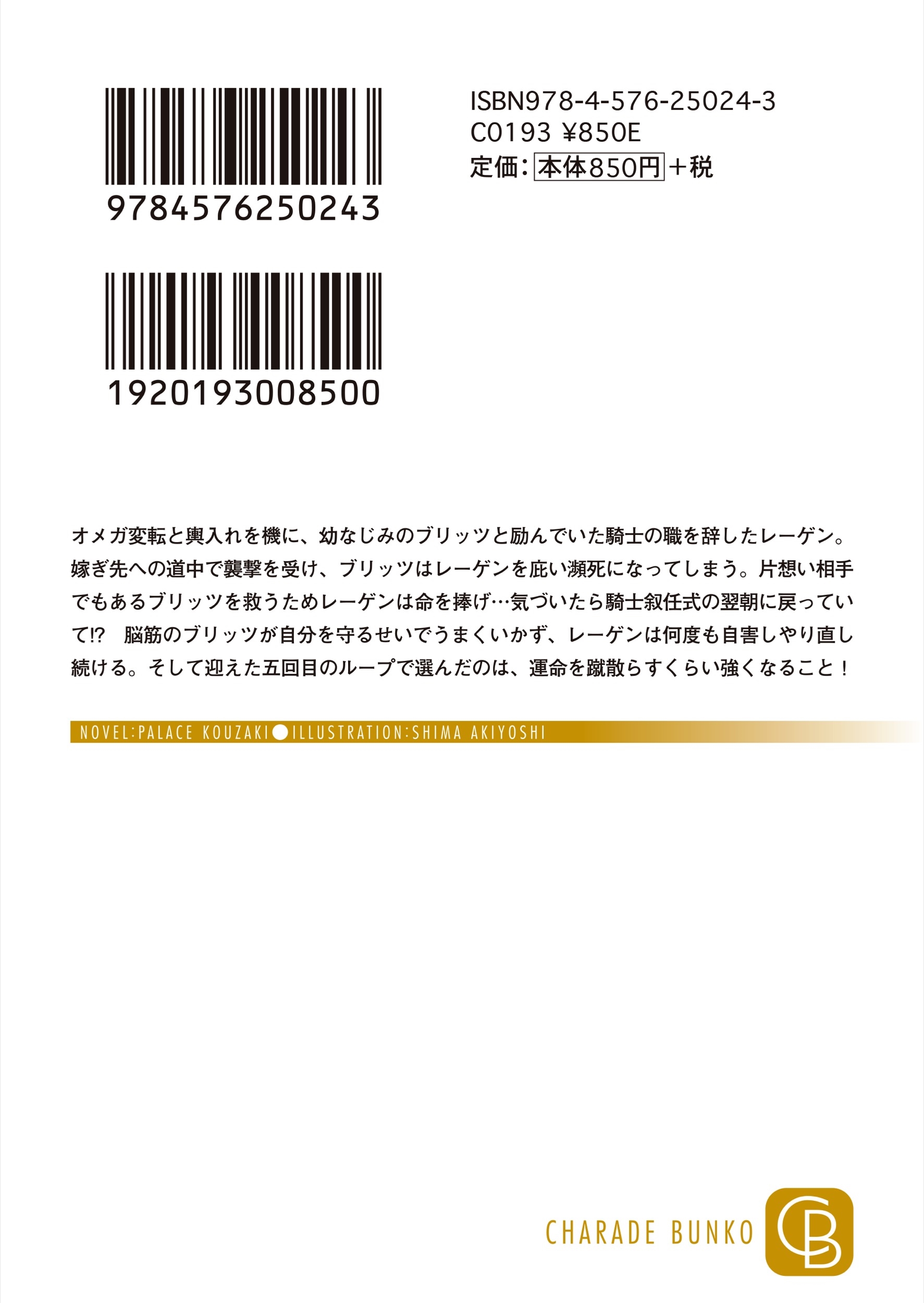 オメガ変転と輿入れで、幼なじみのブリッツと励んでいた騎士の職を辞したレーゲン。嫁ぎ先への道中に襲撃を受け、ブリッツはレーゲンを庇い瀕死になってしまう。恋の相手でもあるブリッツを救うためレーゲンは命を捧げ…気づいたら騎士叙任式の翌朝に戻っていて!? 脳筋のブリッツが自分を守るせいでうまくいかず、レーゲンは何度も自害しやり直し続ける。そして迎えた五回目のループで選んだのは、運命を蹴散らすくらい強くなること!