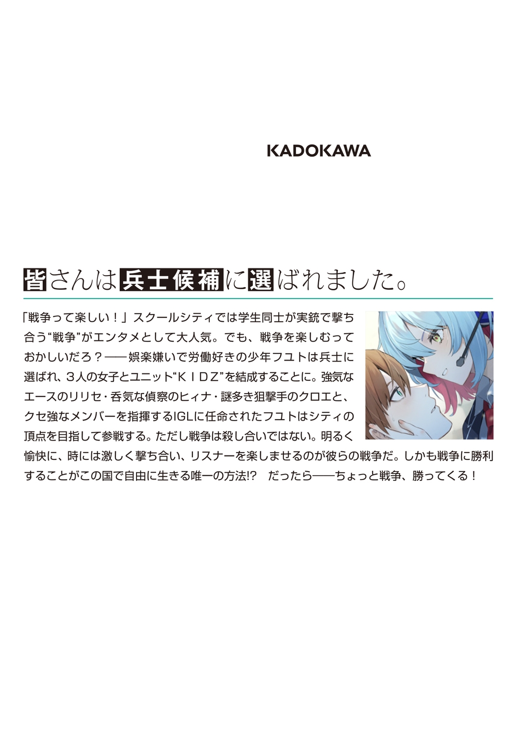 娯楽嫌いで労働好きの少年フユトは戦争の兵士に選ばれ、3人の女子とユニット"KIDZ"を結成することに。強気なエースのリリセ・呑気な偵察のヒィナ・謎多き狙撃手のクロエと、クセ強なメンバーを指揮するIGLに就任したフユトはシティの頂点を目指して参戦する。ただし戦争は殺し合いではない。明るく愉快に、時には激しく撃ち合い、リスナーを楽しませるのが彼らの戦争だ。