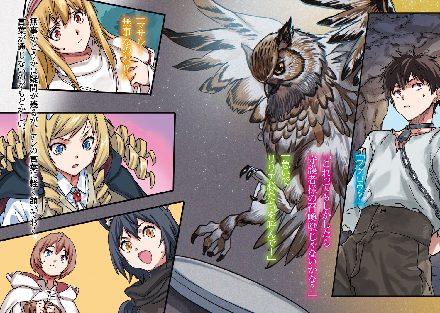 転移でエルフの里へ向かうマサルだったが、帝国の王城に展開していた「転移術師を捕まえる罠」にかかり囚われの身となってしまう。塔に監禁され尋問を受けるマサルは、この状況を危惧し早急に仲間と連絡を取るべく監視役の隙を突いて召喚獣(フクロウ)をエルフ屋敷に飛ばし助けを求めるのだった。