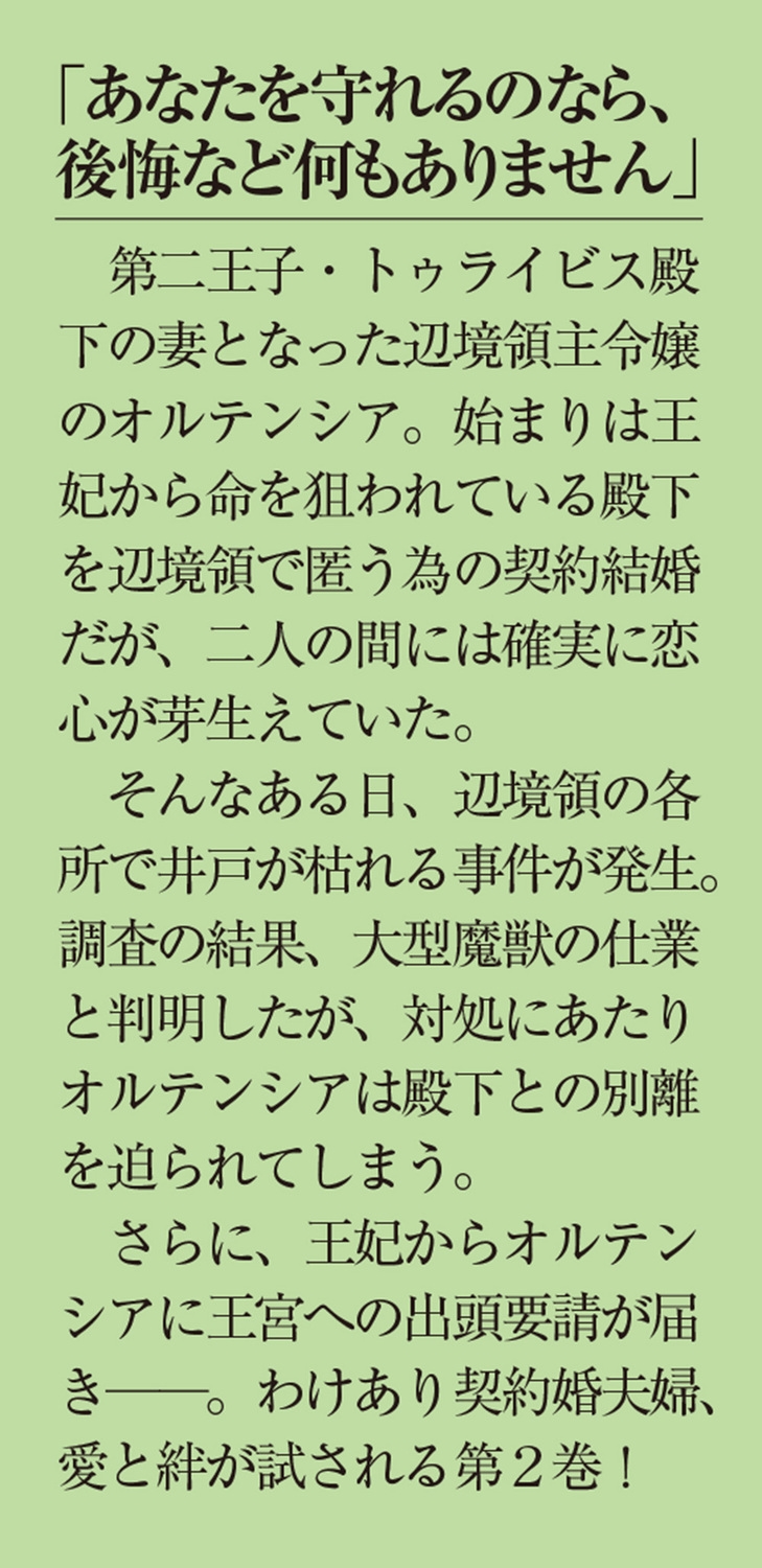 第二王子・トゥライビス殿下の妻となった辺境領主令嬢のオルテンシア。始まりは王妃から命を狙われている殿下を辺境領で匿う為の契約結婚だが、二人の間には確実に恋心が芽生えていた。