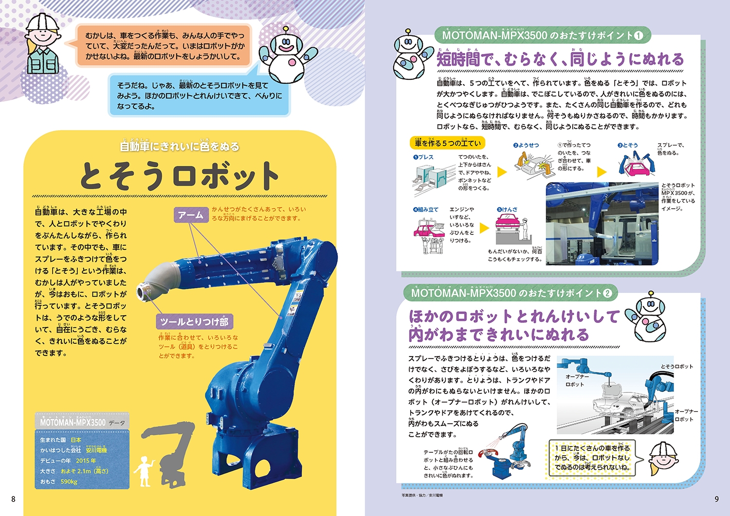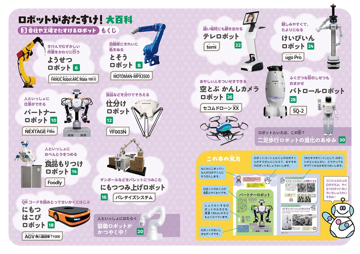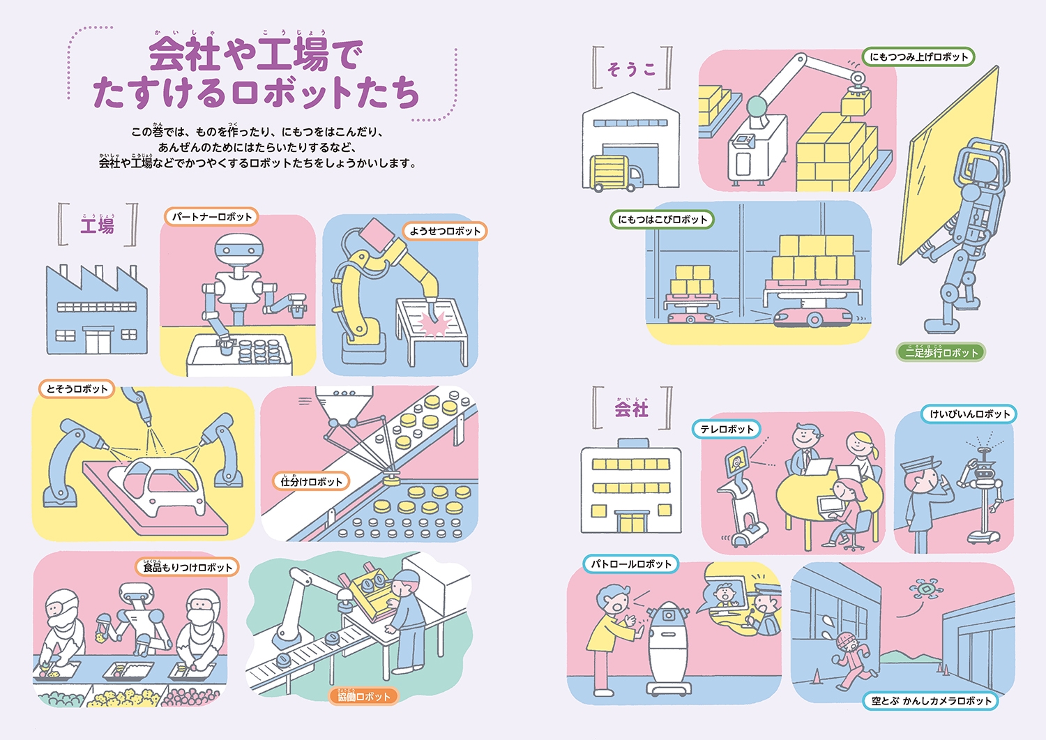 重労働で危険性が高かったり、人手が足りなかったりする工場での物づくりや、倉庫での荷物運びなどを、さまざまなロボットが引き受けます。遠隔での会議や警備など、会社でもロボットは大活躍! 人と一緒に働く協働ロボットも紹介。