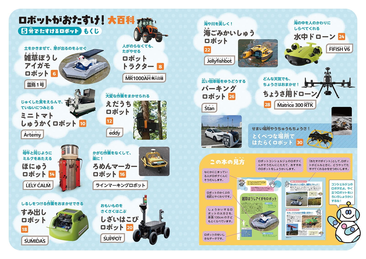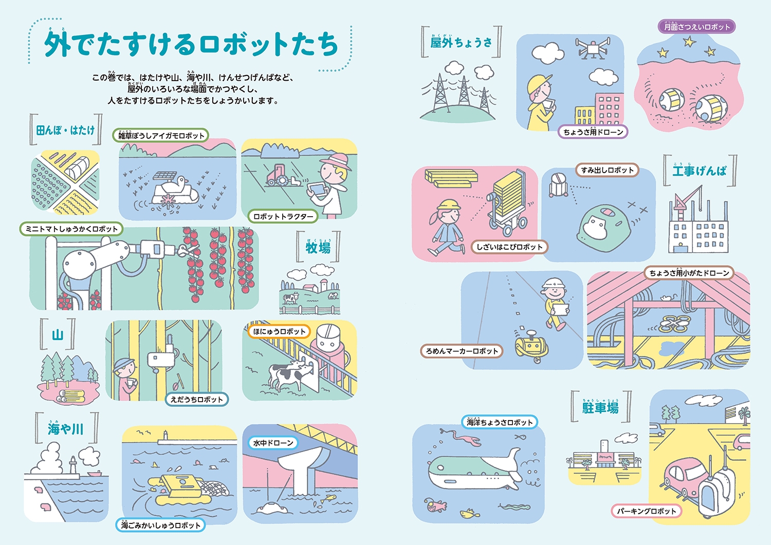 人手が激減する農業や林業、畜産業の現場で、ロボットたちが負担を減らし、未来を開いています。建設現場やさまざまな調査でも、ドローンなどのロボットたちが活躍。ほかにも駐車場など、屋外で働くロボットたちを紹介します。