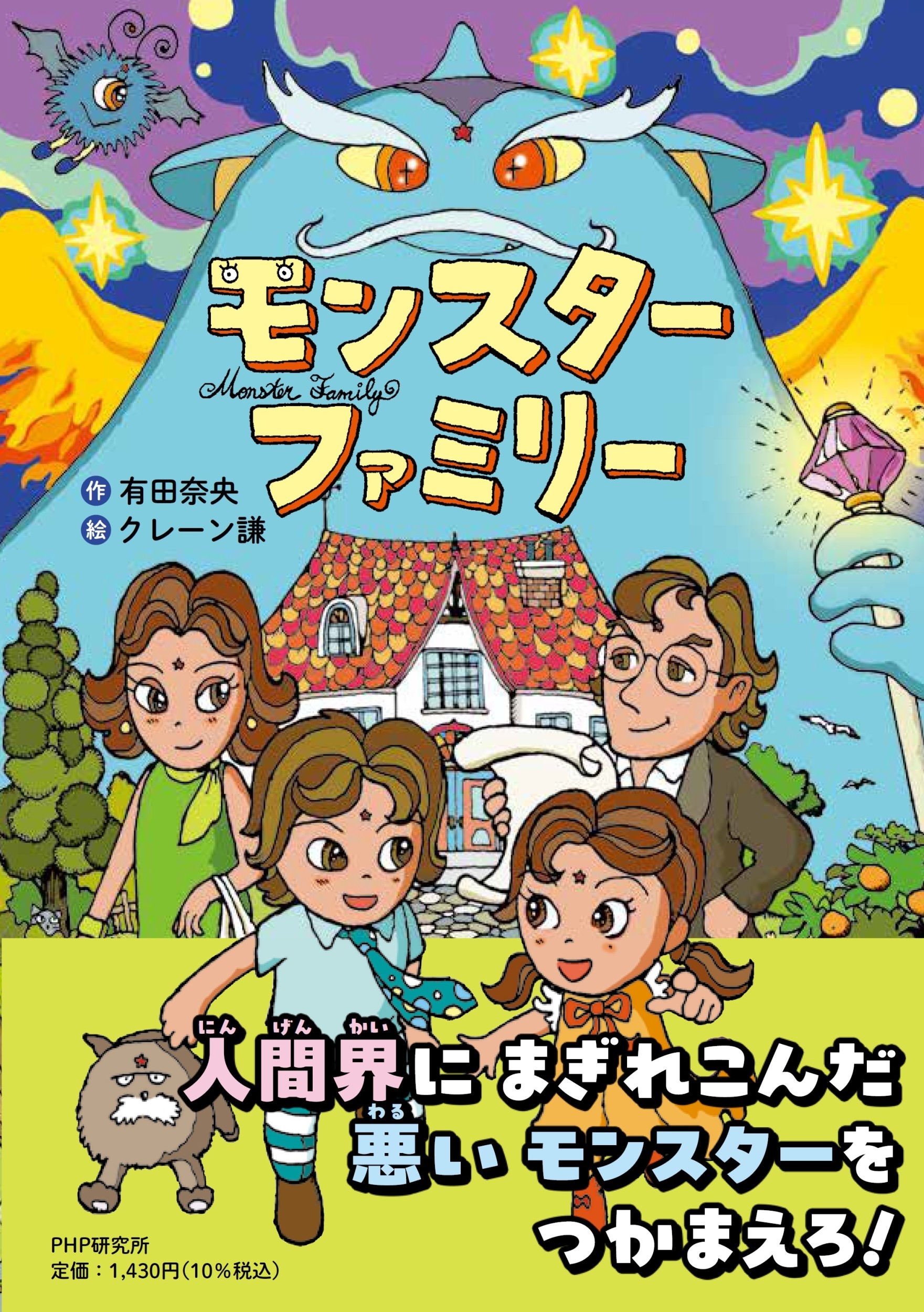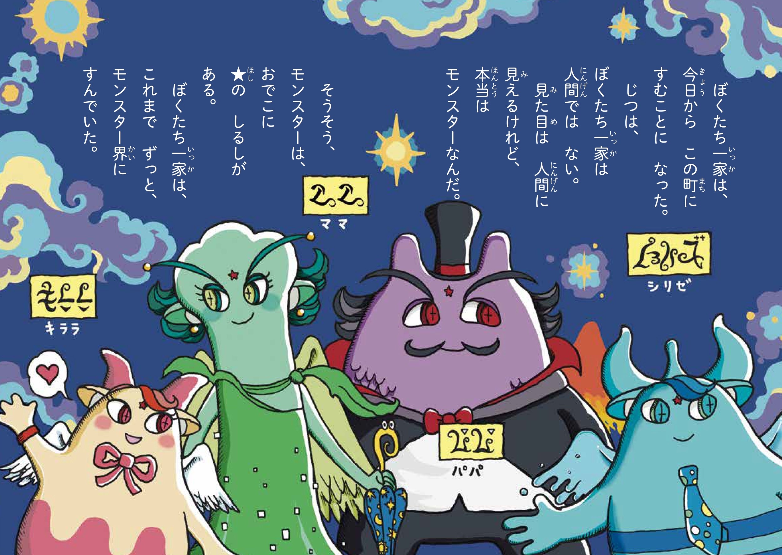 モンスターファミリーは、モンスター界の王さまから命令されて、人間の世界に住むことになりました。王さまから言われたのは、人間界のようすを観察して報告すること。そして、人間界にやってきたモンスターの中で悪いことをするモンスターをつかまえること。モンスターには、おでこに★のしるしがあって、変身して人間の姿になることができるのです。