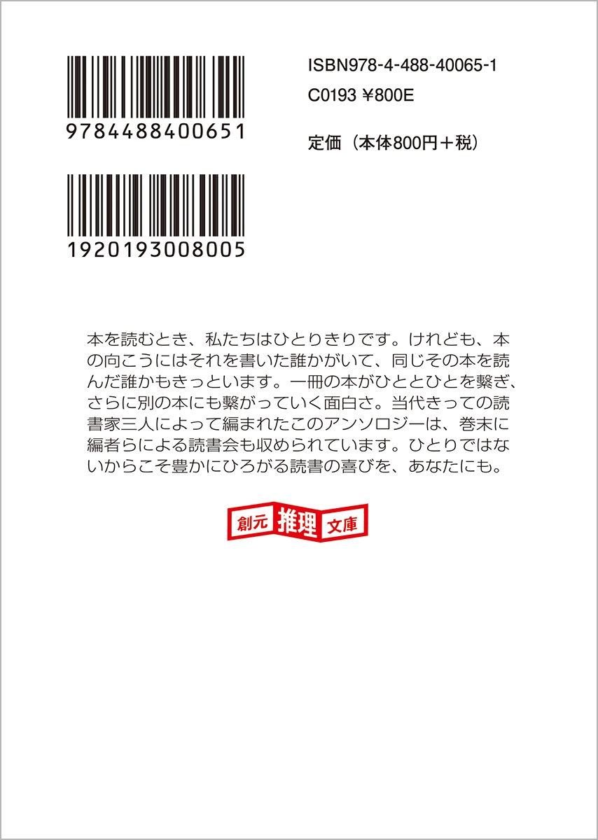 本を読むとき、私たちはひとりきりです。けれども、本の向こうにはそれを書いた誰かがいて、同じその本を読んだ誰かもきっといます。一冊の本がひととひとを繋ぎ、さらに別の本にも繋がっていく面白さ。当代きっての読書家三人によって編まれたこのアンソロジーは、巻末に編者らによる読書会も収められています。ひとりではないからこそ豊かにひろがる読書の喜びを、あなたにも。