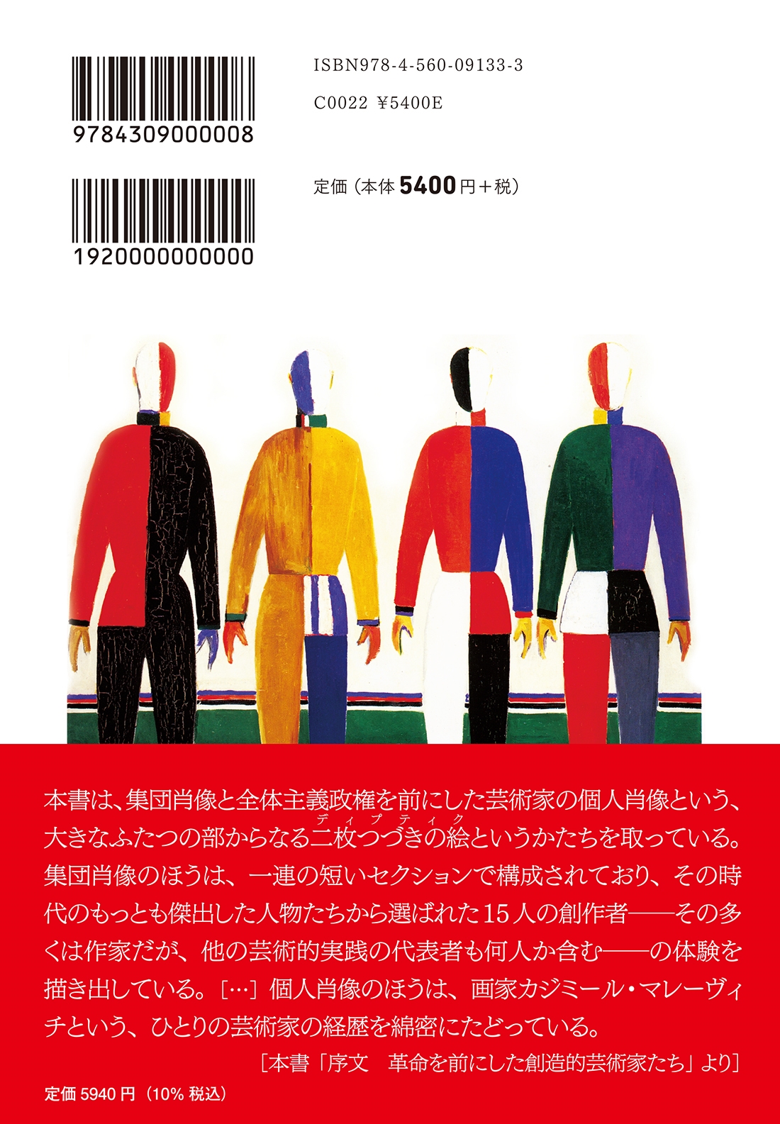 〈本書は、集団肖像と全体主義政権を前にした芸術家の個人肖像という、大きなふたつの部からなる二枚つづきの絵というかたちを取っている。[…]個人肖像のほうは、画家カジミール・マレーヴィチという、ひとりの芸術家の経歴を綿密にたどっている〉(「序文」より)。