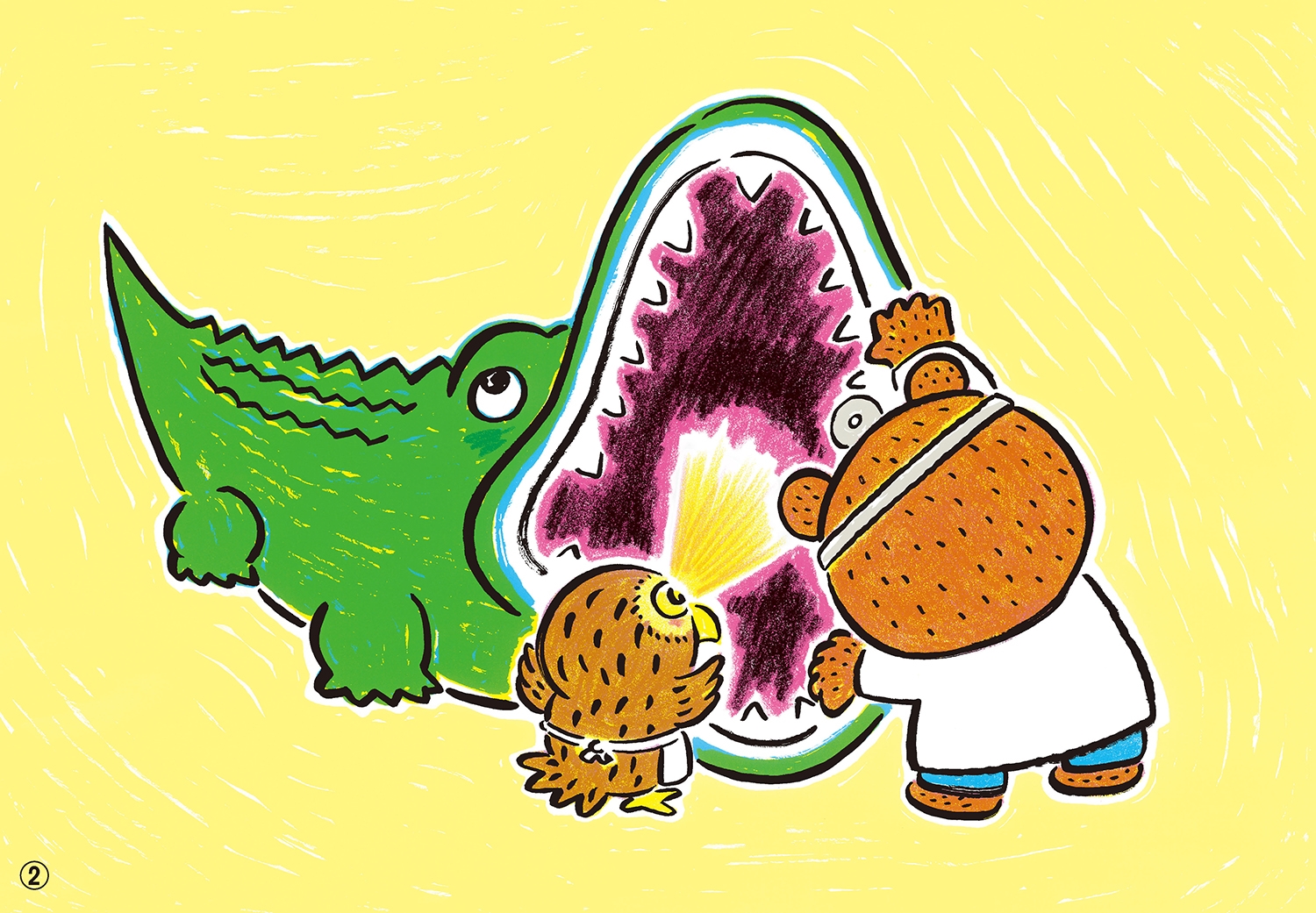 くませんせいは、「あわてない あわてない」と、わにさんの体をなでなで、もみもみしました。すると……。