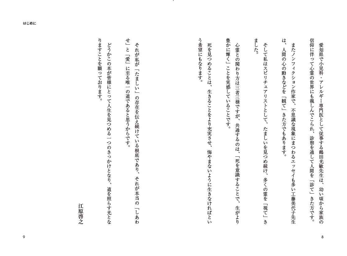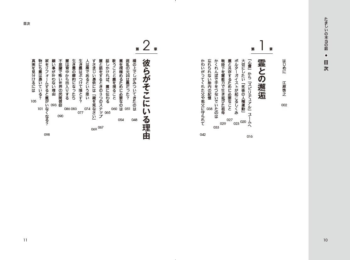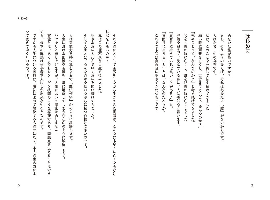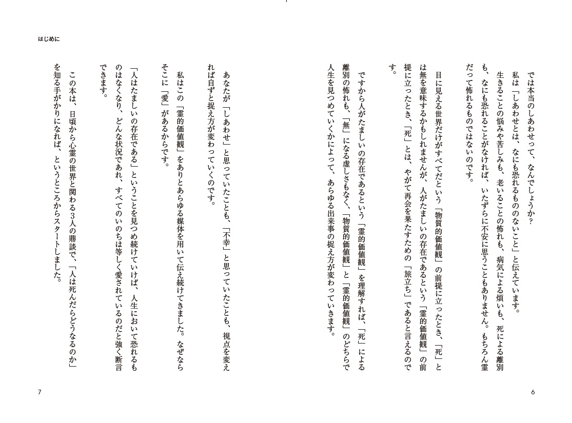 「人は死んだらどうなるのか」――その答えを求めて、鼎談は始まりました。幼い頃の不思議な体験、能力へのめざめ、日本と世界の心霊界のいま、そして私たちはどう生きるべきか・・・ますます熱を帯びる鼎談は、冒頭の問いに答えるヒントを与えてくれます。「霊」と聞くと、怪談や心霊写真などの「怖いもの」をイメージするかもしれません。しかし、霊ももとは私たちと同じ、肉体を持つ人間でした。そう考えると、霊がぐっと身近なものに感じられ、怖さがなくなることでしょう。霊に対する誤った認識を解き、霊とともにあることを喜ばしく感じる、本書を通じてそんな体験をしてみませんか?