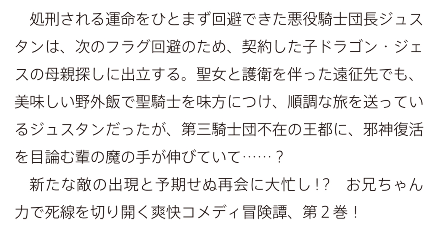 処刑される運命をひとまず回避できた悪役騎士団長ジュスタンは、次のフラグ回避のため、契約した子ドラゴンの母親に会いに出立する。しかし第三騎士団不在の王都に、邪神復活を目論む輩の魔の手が伸びていて……?