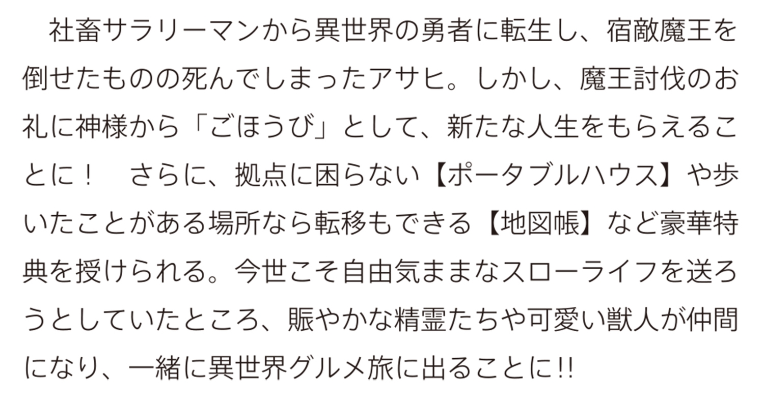 社畜サラリーマンから異世界の勇者に転生し、宿敵魔王を倒せたものの死んでしまったアサヒ。しかし、魔王討伐のお礼に神様から「ごほうび」として、新たな人生をもらえることに!