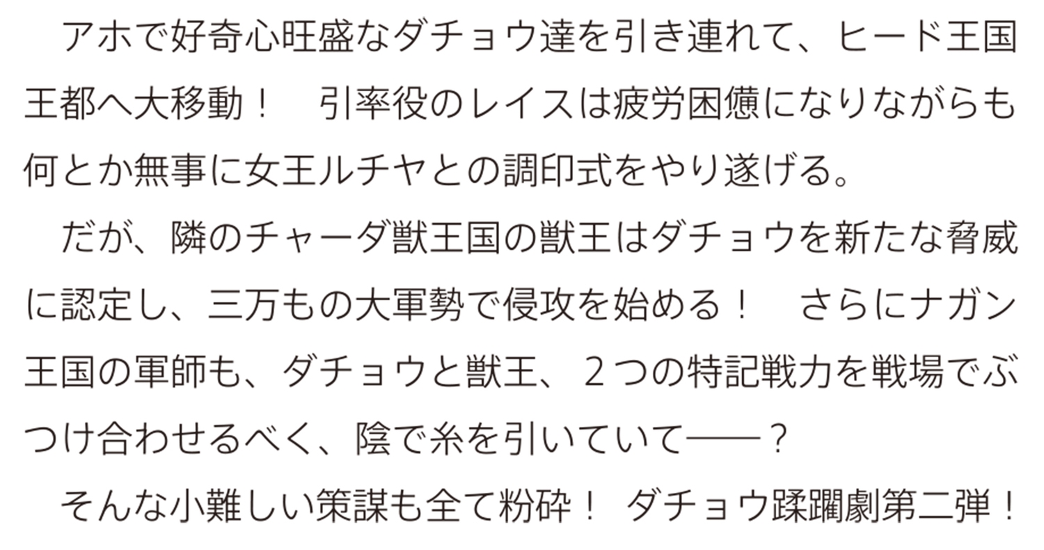 だが、隣のチャーダ獣王国の獣王はダチョウを新たな脅威に認定し、三万もの大軍勢で侵攻を始める!