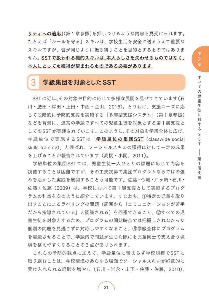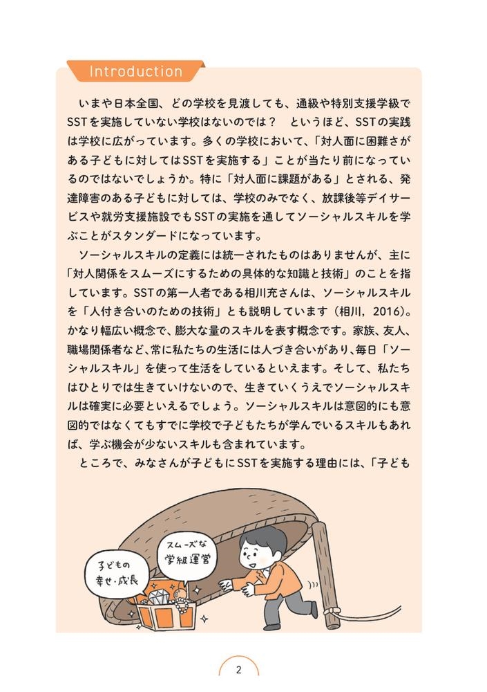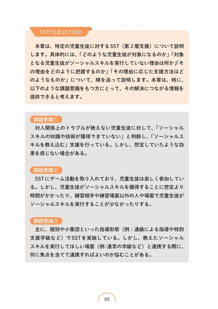 本書では、「子ども主体のSST」がどのようなものであるか、多層支援(第1層=すべての子ども、第2層=個別ニーズのある子ども)の導入時のポイントや、子どもたちのつまずきタイプ別にみた標的スキル(獲得すべきスキル)の見立て、実践上の工夫、実践後の振り返り(評価)などの具体的な方法を紹介します。
