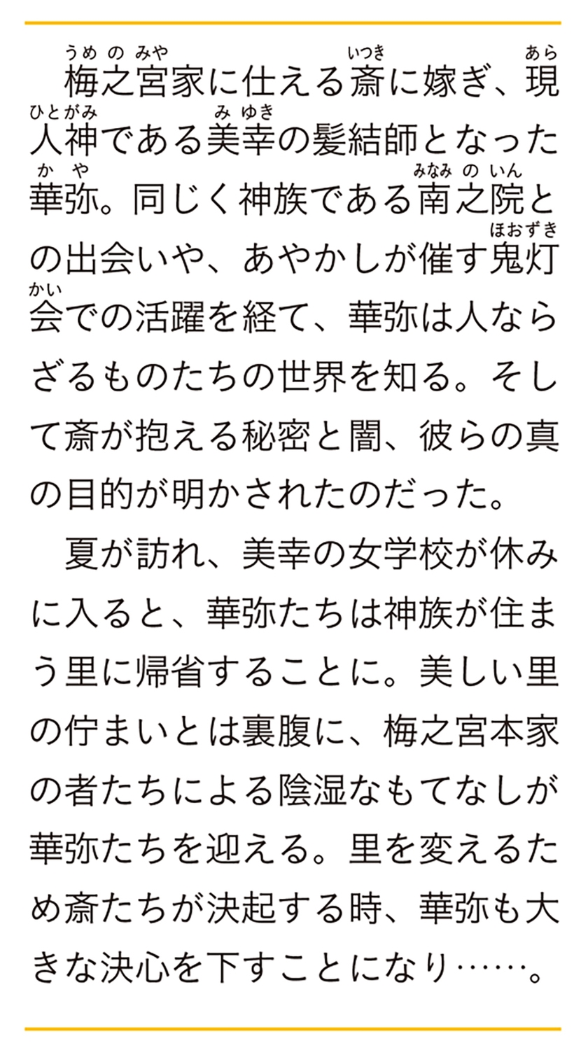 梅之宮家に仕える斎に嫁ぎ、現人神である美幸の髪結師となった華弥。同じく神族である南之院との出会いや、あやかしが催す鬼灯会での活躍を経て、華弥は人ならざるものたちの世界を知る。そして斎が抱える秘密と闇、彼らの真の目的が明かされたのだった。
