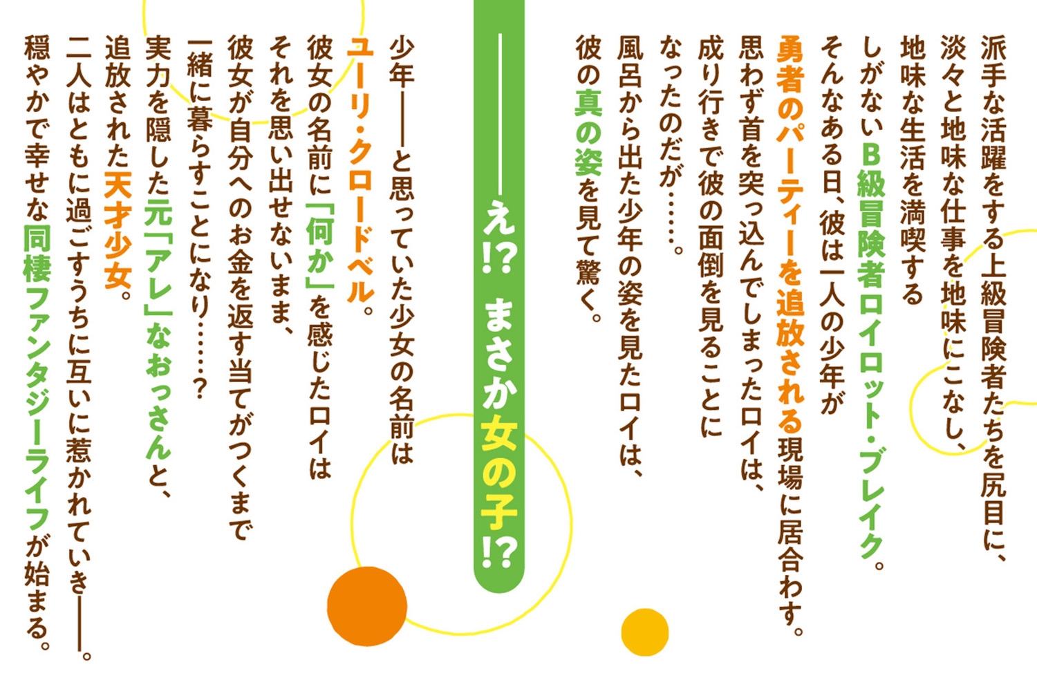 実力を隠した元「アレ」なおっさんと、追放された天才少女。二人はともに過ごすうちに互いに惹かれていき──。穏やかで幸せな同棲ファンタジーライフが始まる。