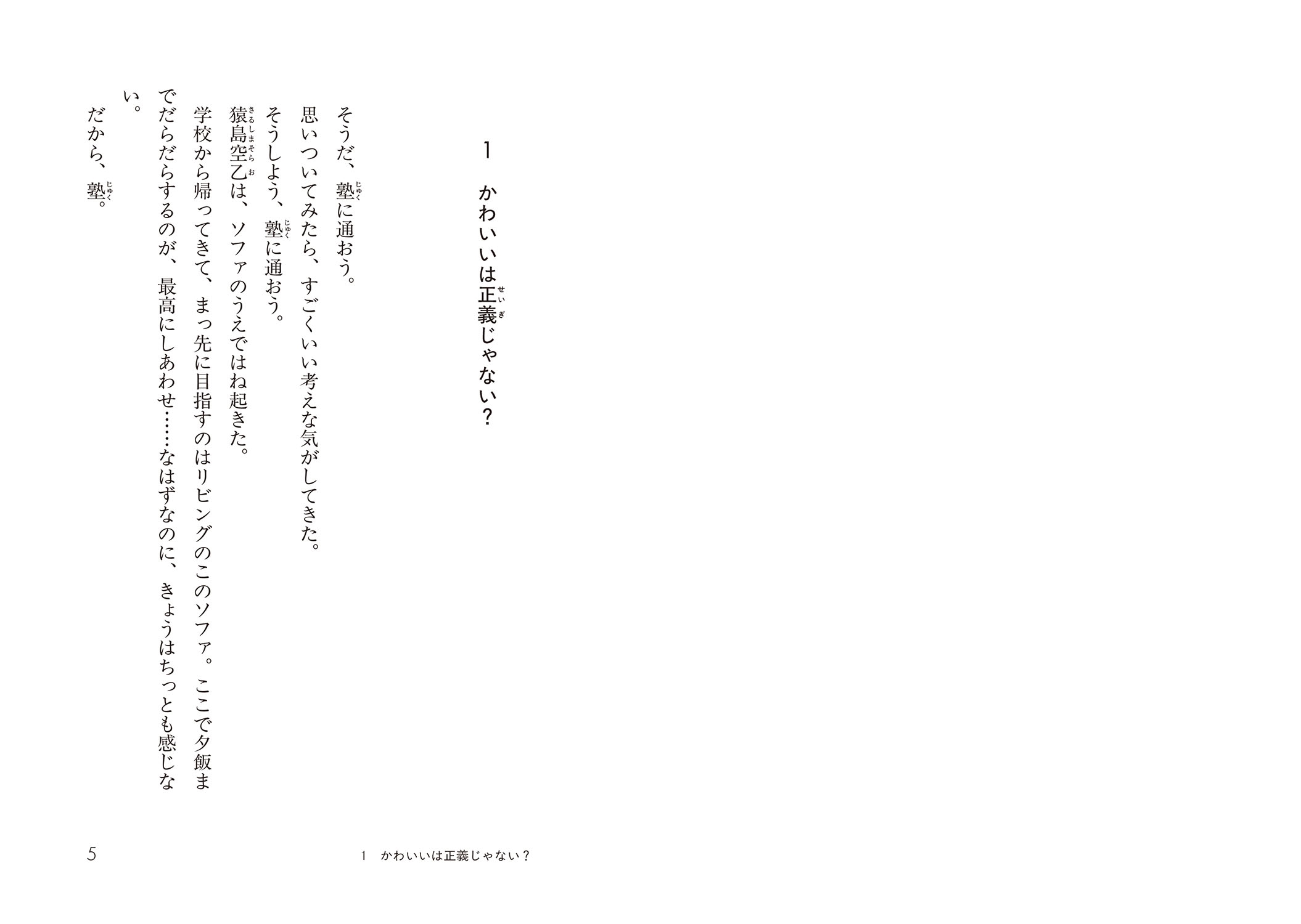 小学6年女子・猿島空乙(サルシマ・ソラオ)は、好きな男子から「ルッキズムも知らないの?」と言われたことをきっかけに、世の中のことをもっと知りたい!と思うようになります。そんな希望をかなえてくれそうな<Q世代塾>を見つけます。先生は、高校生。生徒は、子どもから高齢者までいろいろ。性別もわからない先生に、顔をしかめる人もいます。若者世代と年配世代のギャップ(=感覚のズレ)が生じるなかで、ソラオは、偏見とは何か、差別とは何か、少しずつ自分の頭で考えはじめます。ユニークな設定で、主人公の変化、成長をえがく児童小説。